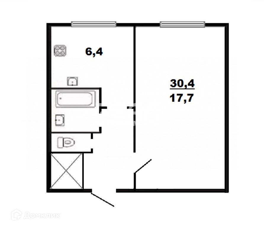 Общая площадь 30.4 кв.м., комната 17.7 кв.м., кухня 6.4 кв.м.