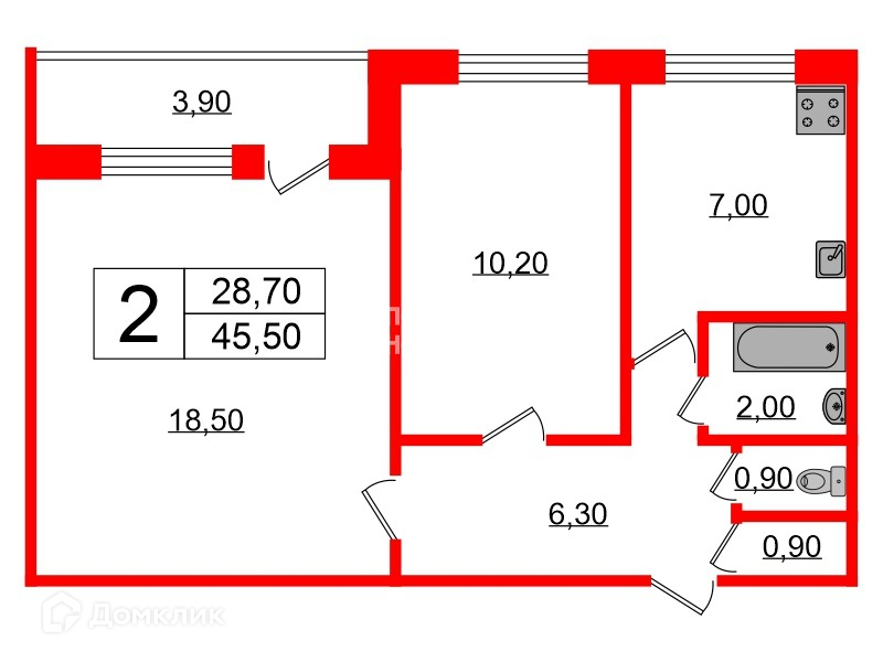 Общая площадь 45.5 м2