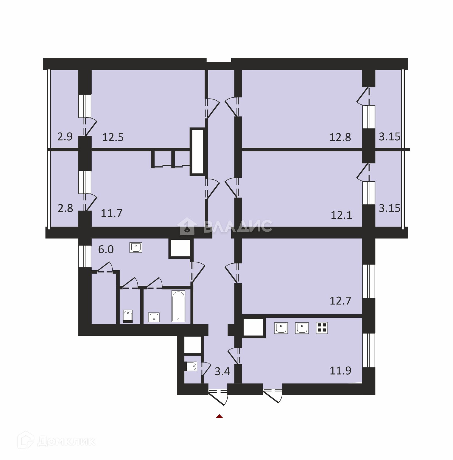 Жилая площадь 61,8м2, комнаты 12,8+12,7+12,5+12,1+11,7м2