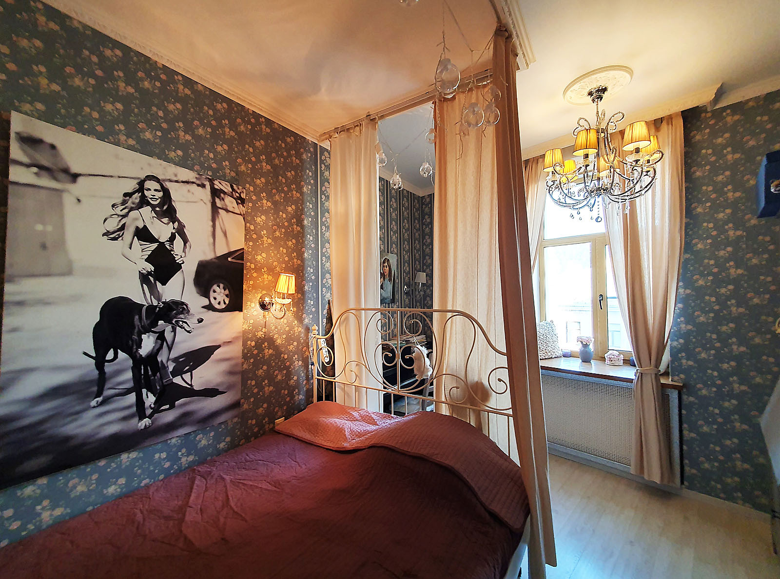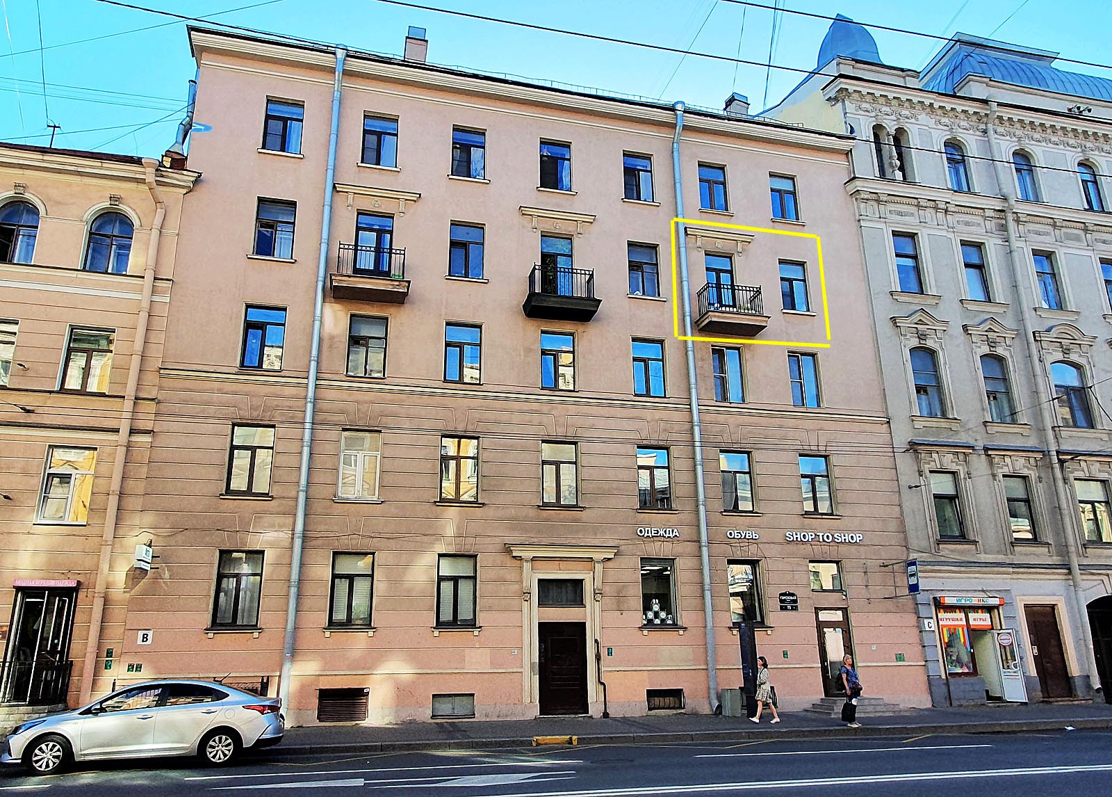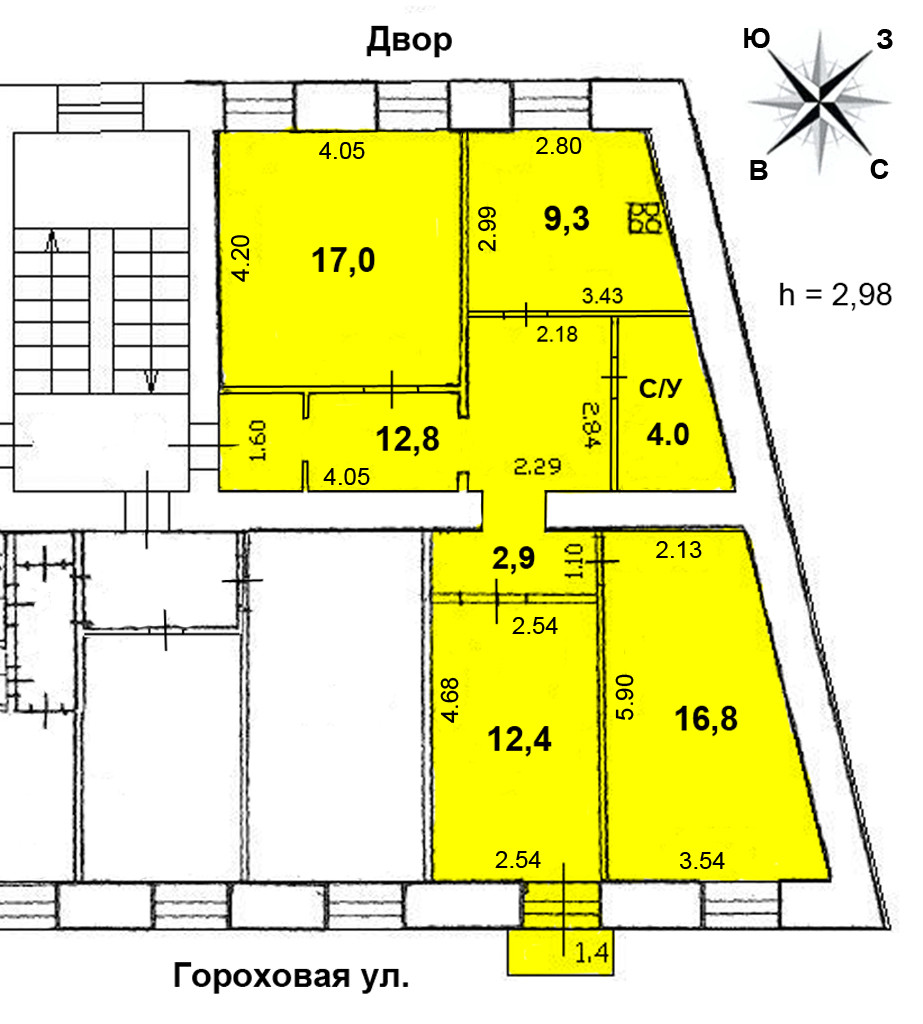 Три изолированные комнаты 17+16.8+12.4 кв.м, 2-комнаты и небольшой балкон 1.4м выходят на Гороховую улицу (северо-восток), 1-комната и кухня - в полуоткрытый светлый двор с зеленью и парковкой (юго-запад), совмещённый санузел 4м, высота потоков 3м, все удобства, газовая колонка, стеклопакеты, металлическая дверь.