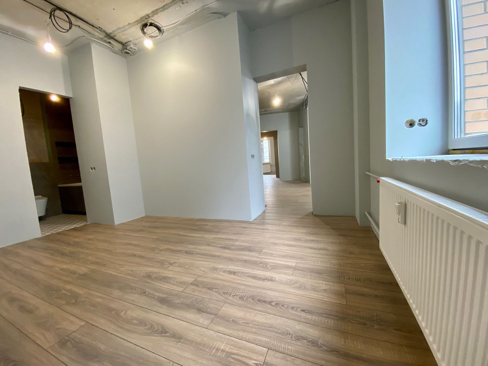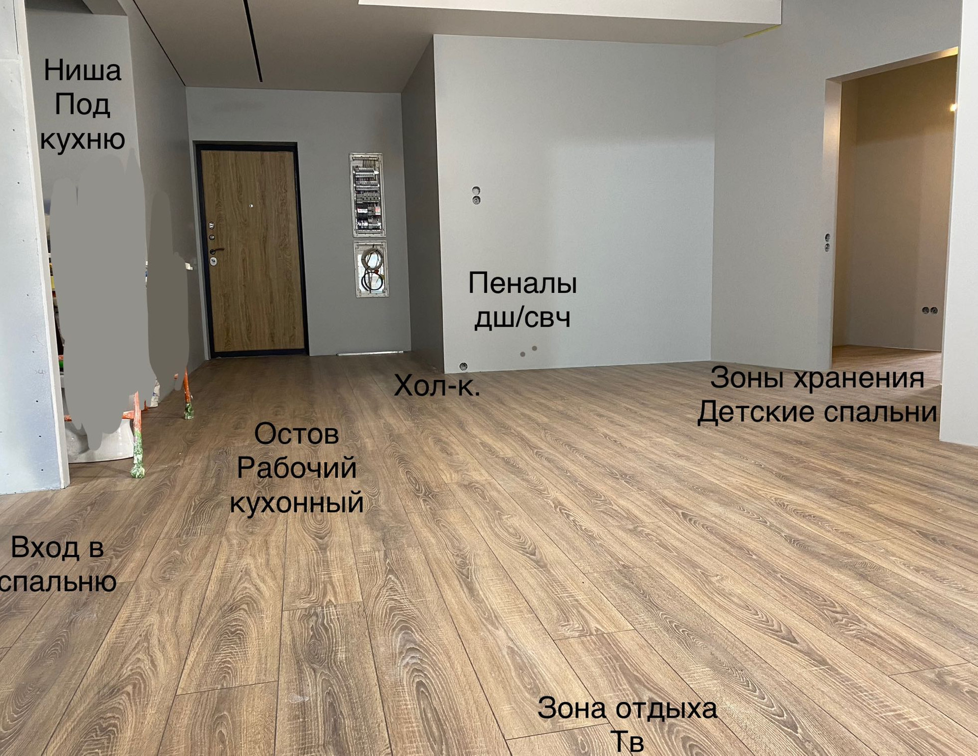 Площадь 84кв.м . Планировка уникальная, Кухня гостиная >25квм.  Грязная зона не проходная, с достаточным пространством для шкафа. В родительской спальне приватный санузел. Покупали для себя, Работы делали качественно! Ремонт на финише, остались мелочи: потолки, двери, плинтуса, розетки. Хозяин - бригадир стройки.