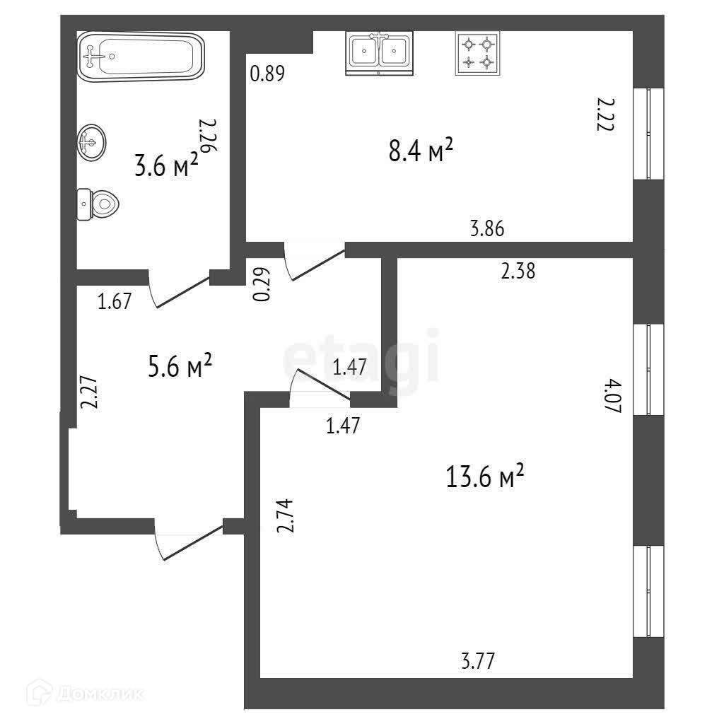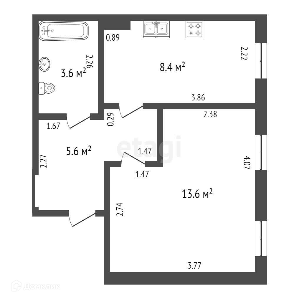 Уютная квартира площадью 31,2 кв.м., кухня прямоугольной формы 8,4 кв.м., комната 13,6 кв.м.