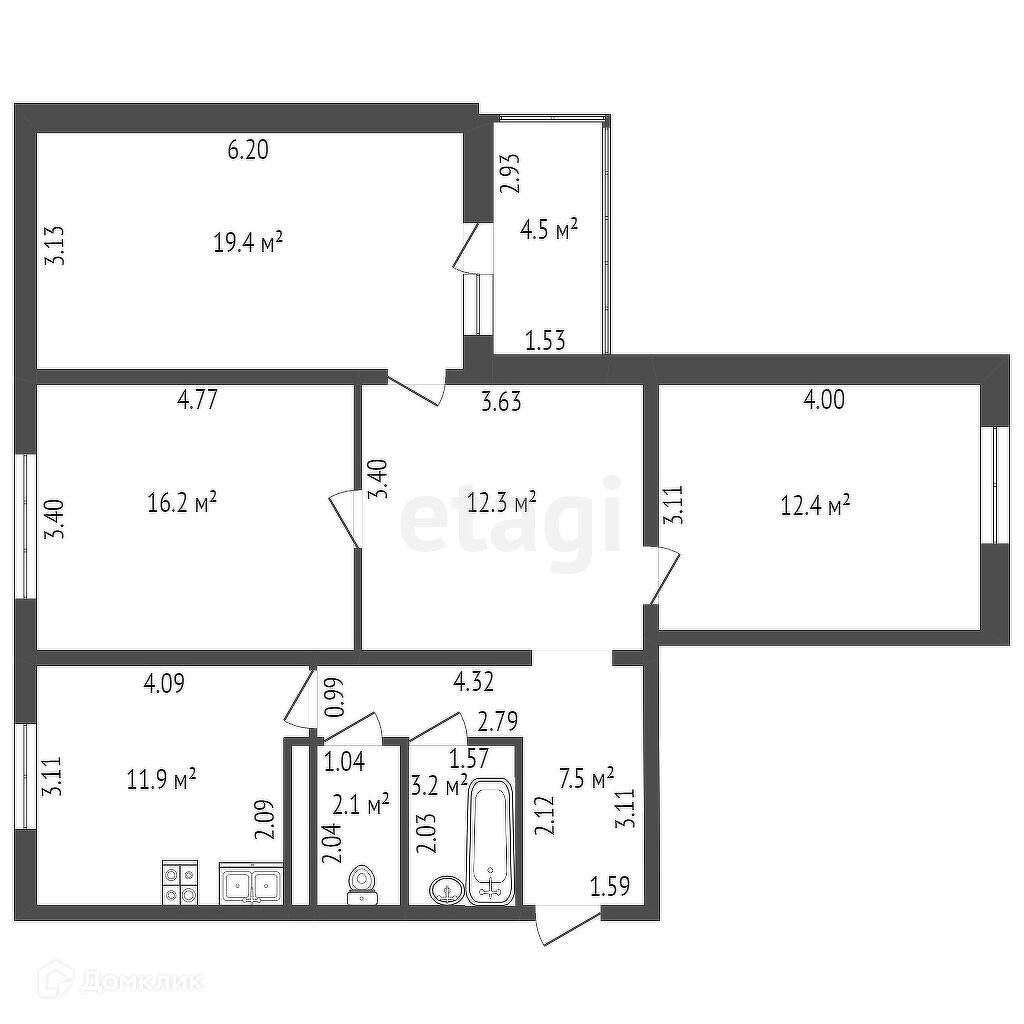 Три изолированные комнаты: 19,4, 16,2, 12,4 кв.м.