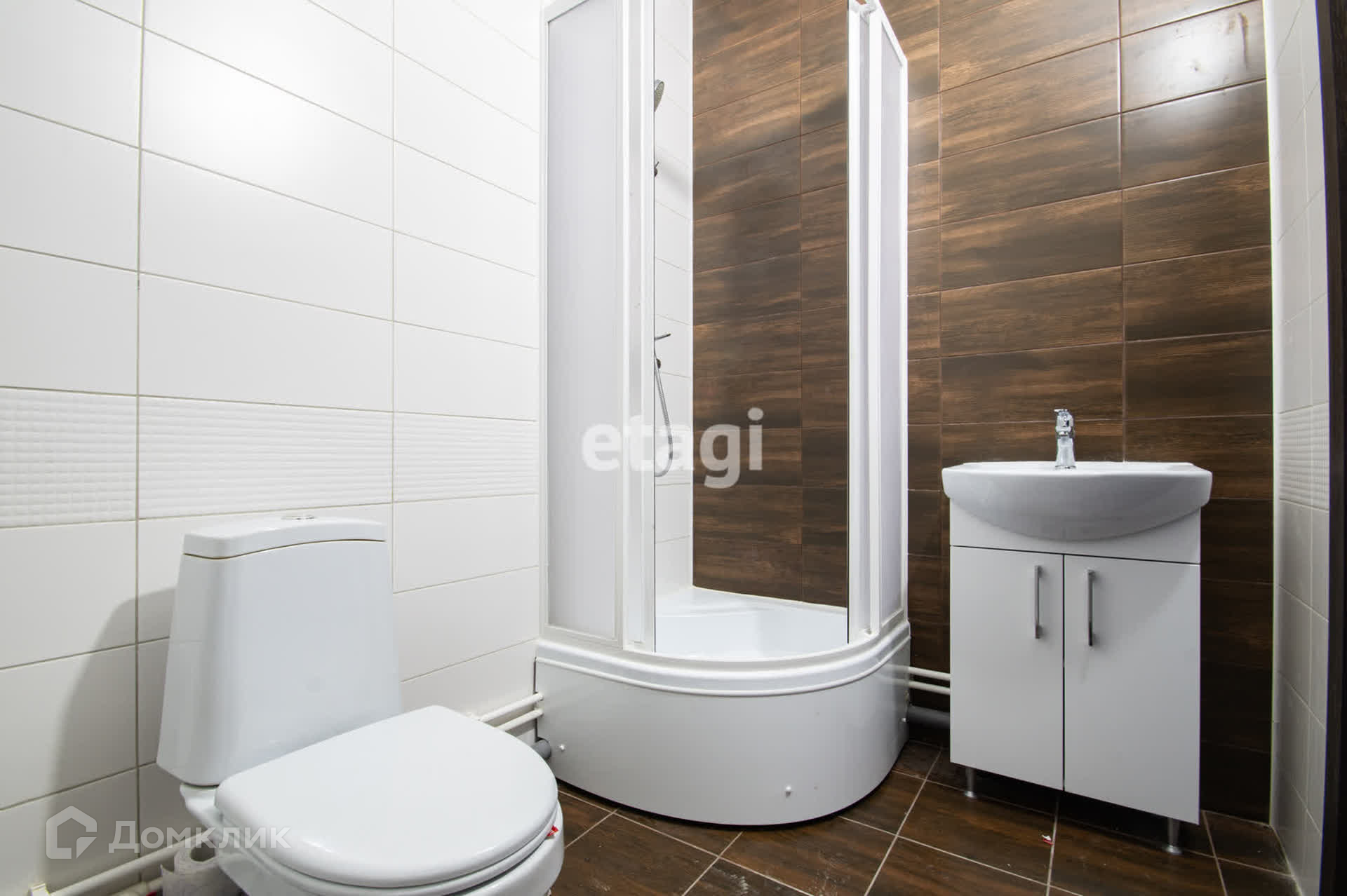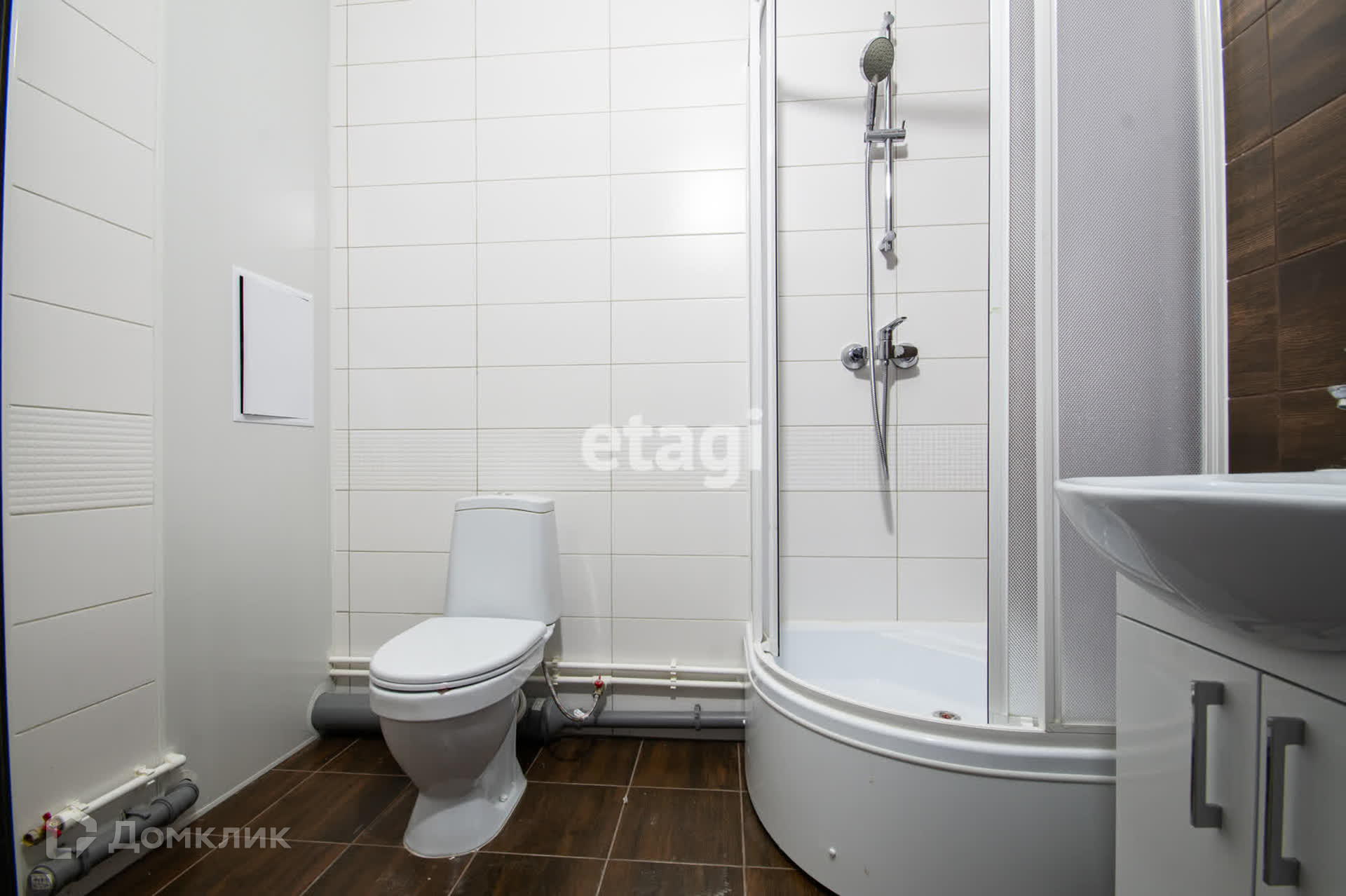 Установлена душевая кабина, унитаз, раковина с тумбой и смесителем.
