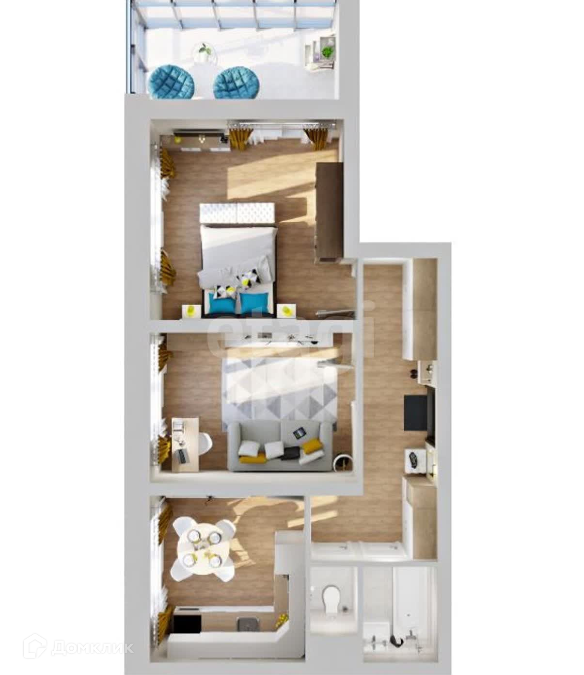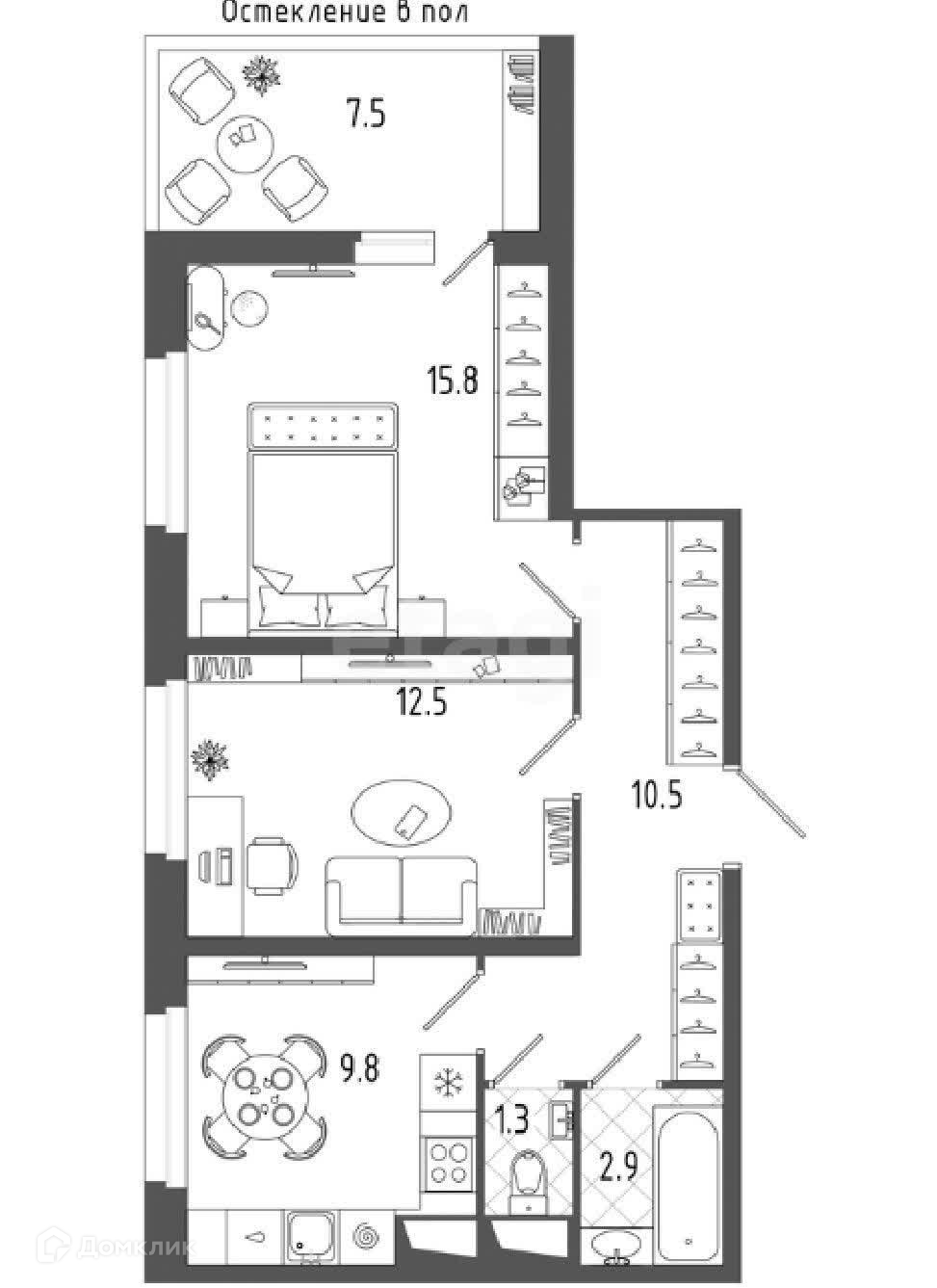 - одна из спален имеет выход на застекленную в пол лоджию (7,4 кв м) - место для отдыха или кабинет;