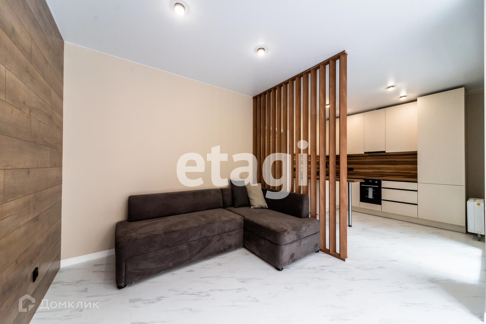 Кухонное пространство отделено стеной из дерева.