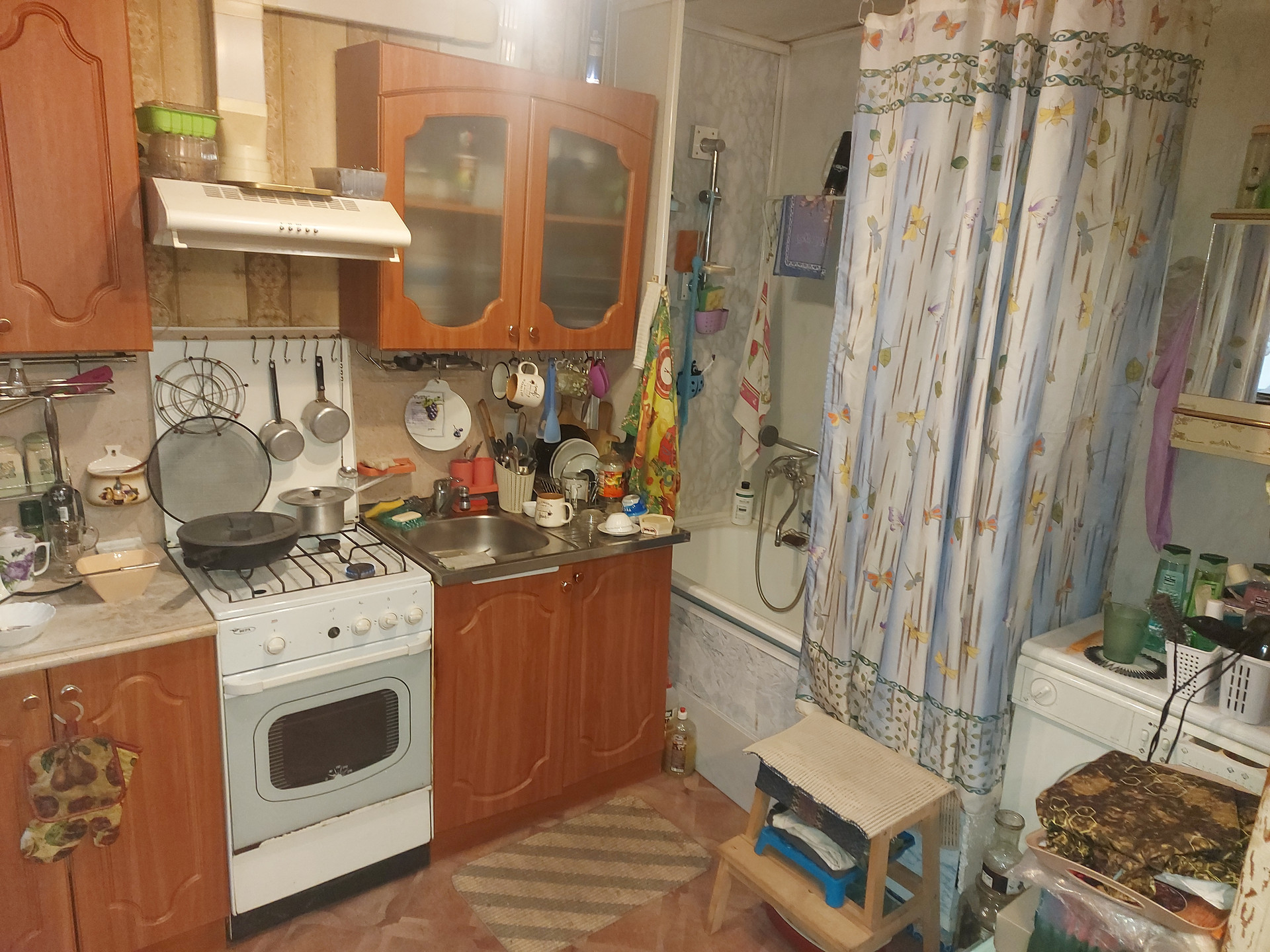 Убрана перегородка отделяющая ванну,которую легко востановить