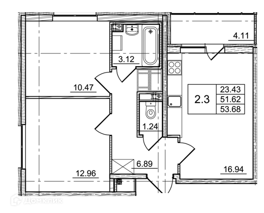 Общая площадь 51.62 м2