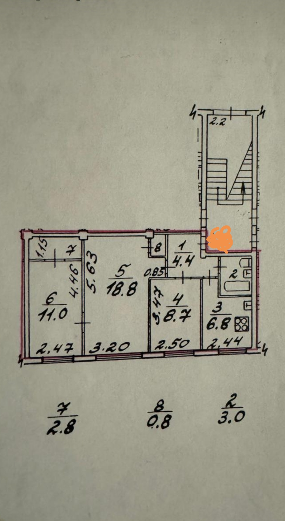 Общая площадь квартиры 56.3 м2. С двумя спальнями 8.7 м2 и 11 м2, гостиная 18.8 м2, кухня 6.8 м2, прихожая 4.4 м2. Санузел совмещенный 3.0 м2. Есть встроенный шкаф и помещение кладовой 2.8м2.  Высота потолков 2.52 м.