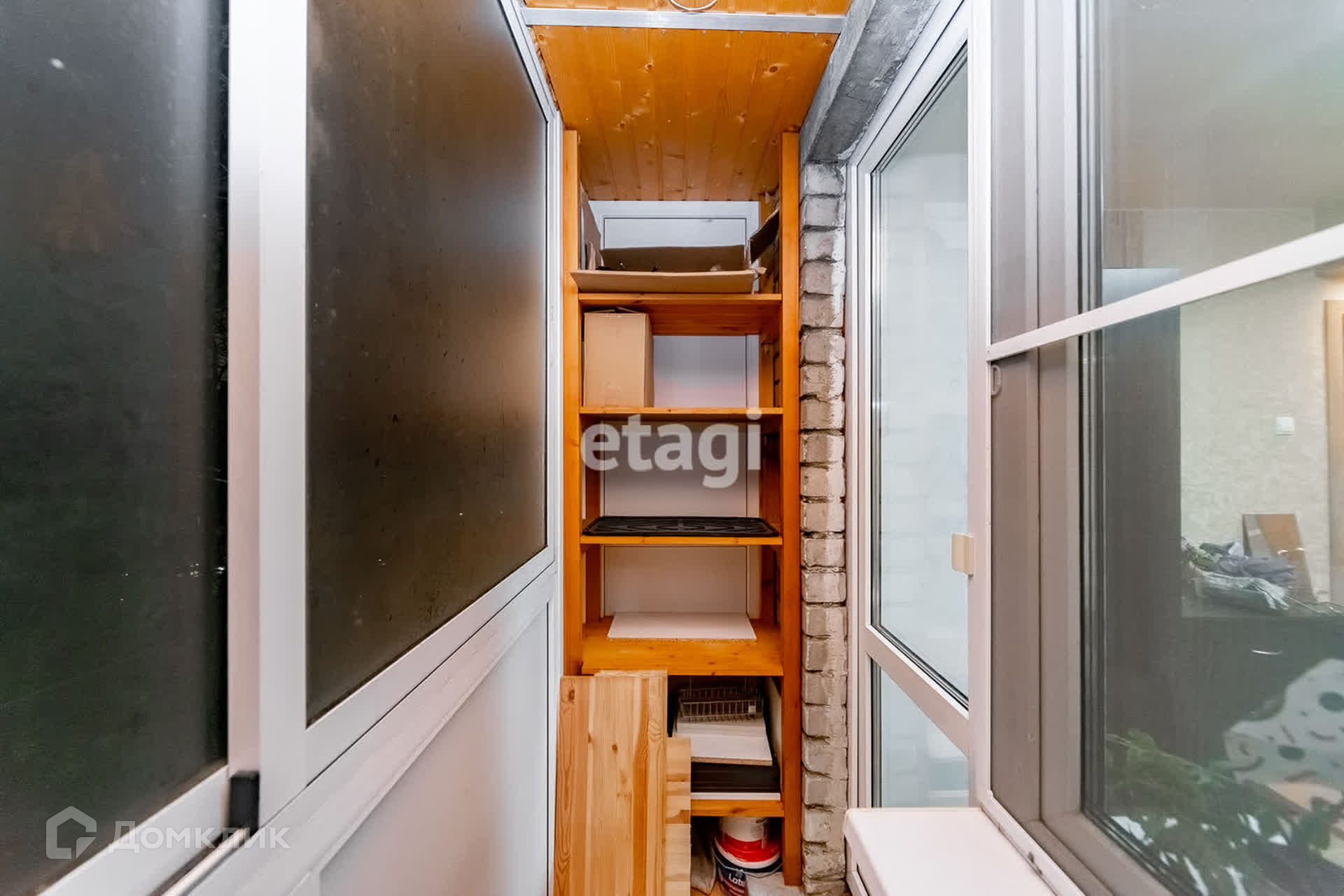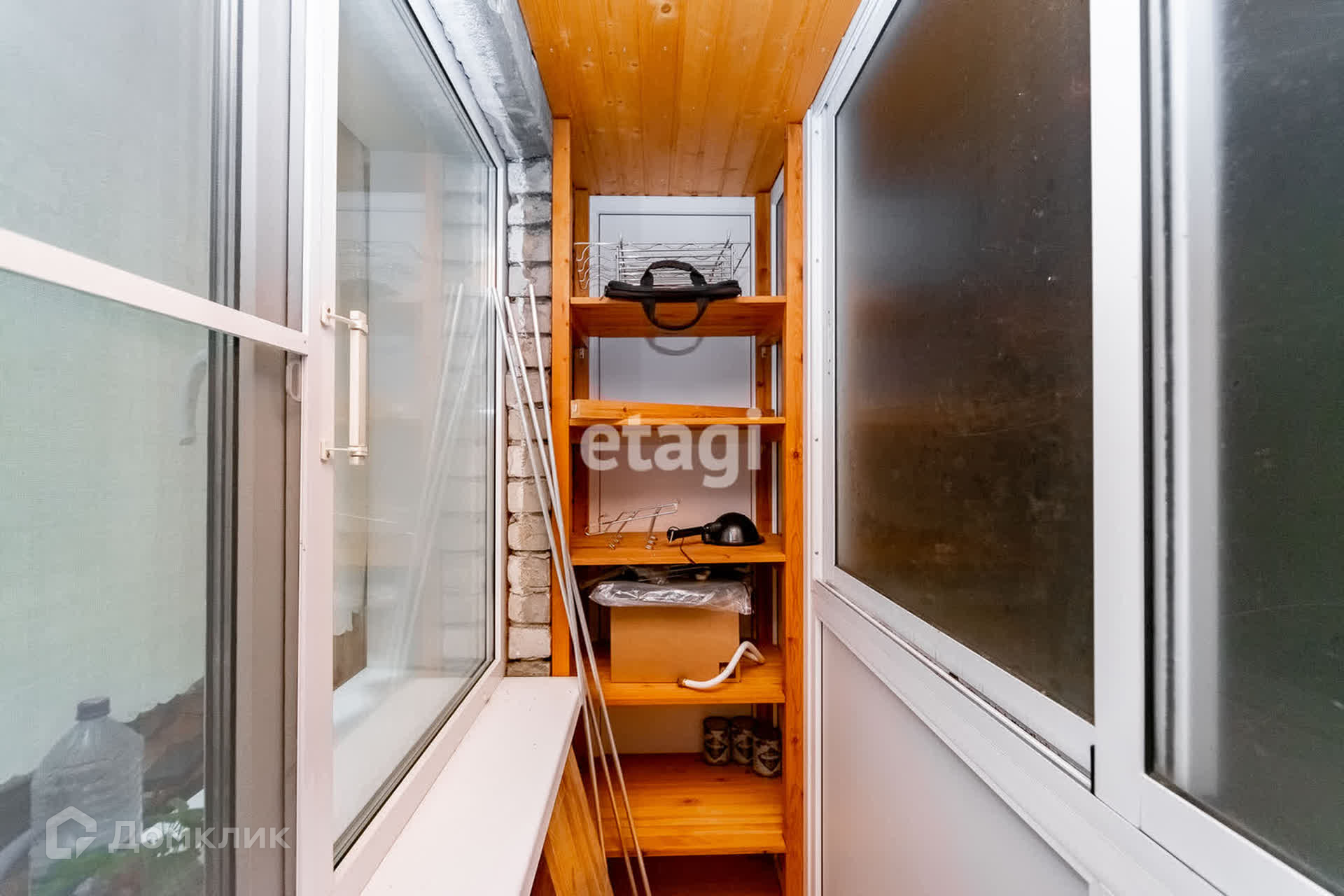 Балкон застеклен, пол утеплен и обшит деревом, потолок вагонка, сделаны два стеллажа для хранения.