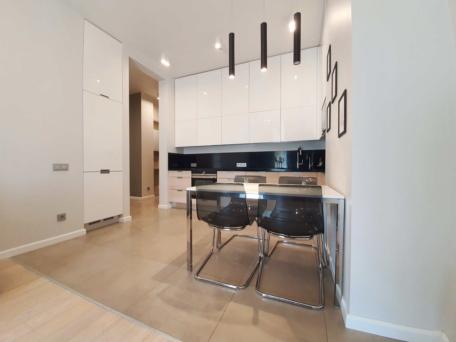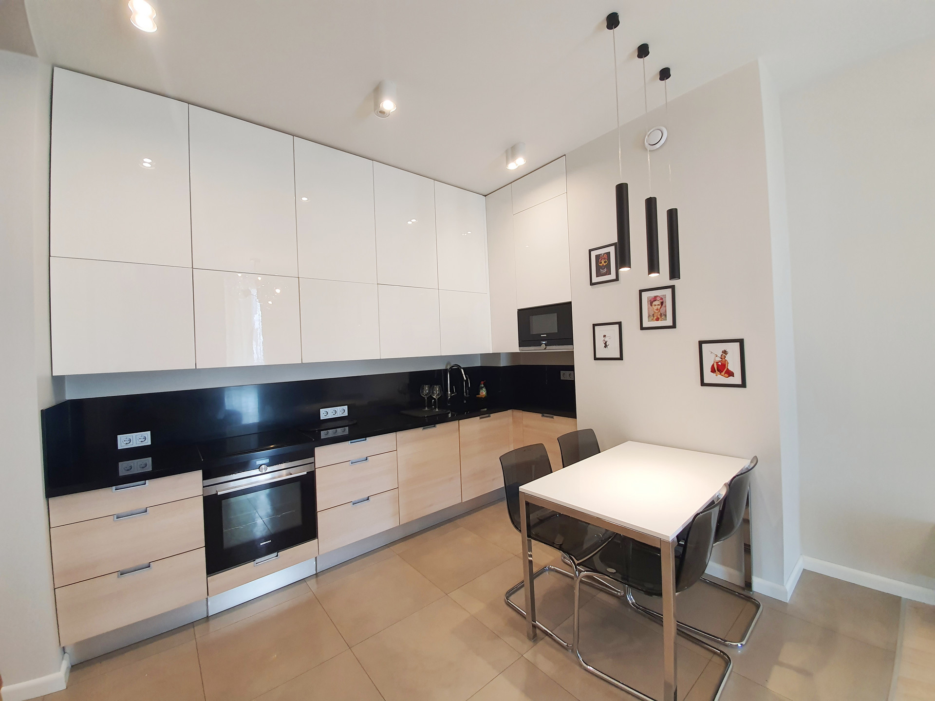 Встроенный кухонный гарнитур укомплектован всей бытовой техникой (встроенный холодильник, духовой шкаф, СВЧ, посудомоечная машина).