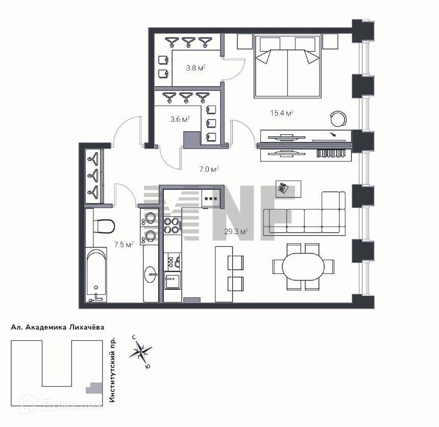 1-комнатная квартира, 66.6 м2, этаж 8 / 23, на продажу в Санкт-Петербурге, Институтский проспект, 16Б