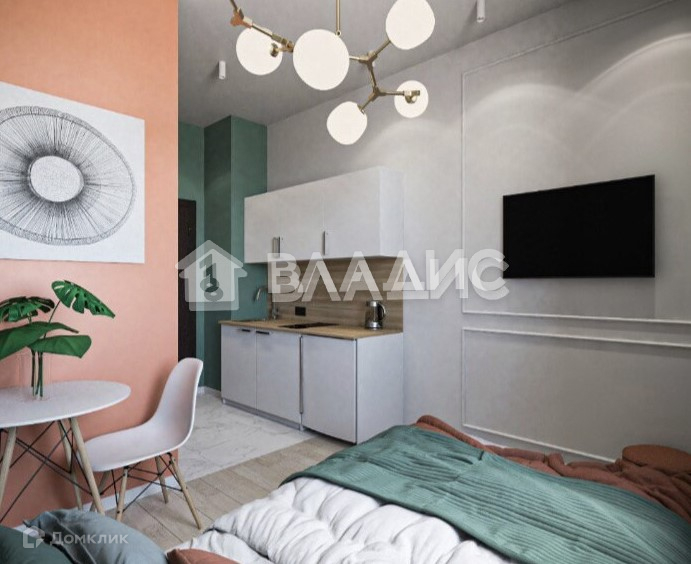 Студия полностью оснащена мебелью и техникой и готова к заселению: кровать, стол, стулья, кухонный гарнитур с плитой, телевизор, стиральная машина, холодильник, чайник, посуда итд