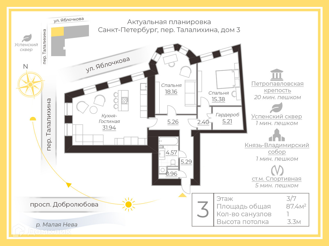 Отдельно хочу обратить Ваше внимание на вид из квартиры, который поразит воображение любого человека, тяготеющего к настоящей красоте и эстетике. Он поистине уникальный из каждого окна квартиры. Из угловой кухни-гостиной открывается вид на, невероятной красоты, Князь-Владимирский собор, подсветка которого ночью относит нас в Европейские пейзажи. Так же из кухни, чуть правее, мы видим геометрию изгиба улицы Талалихина плавно перетекающую в переулок Нестерова. Опять же, ночью, он приобретает совершенно сказочный вид. Дальше у нас комнаты, одна из которых с эркером, окно которого смотрит прямиком на Петропавловскую крепость. Это надо видеть вживую!