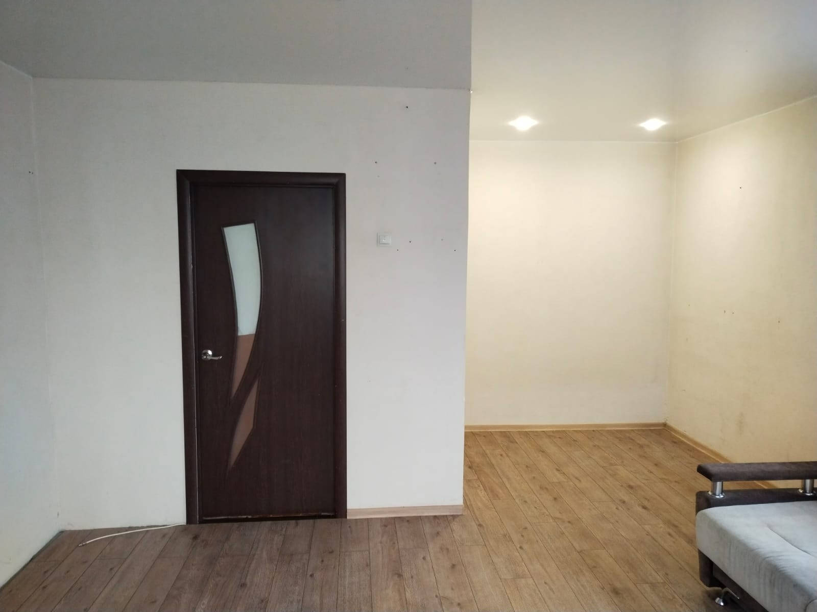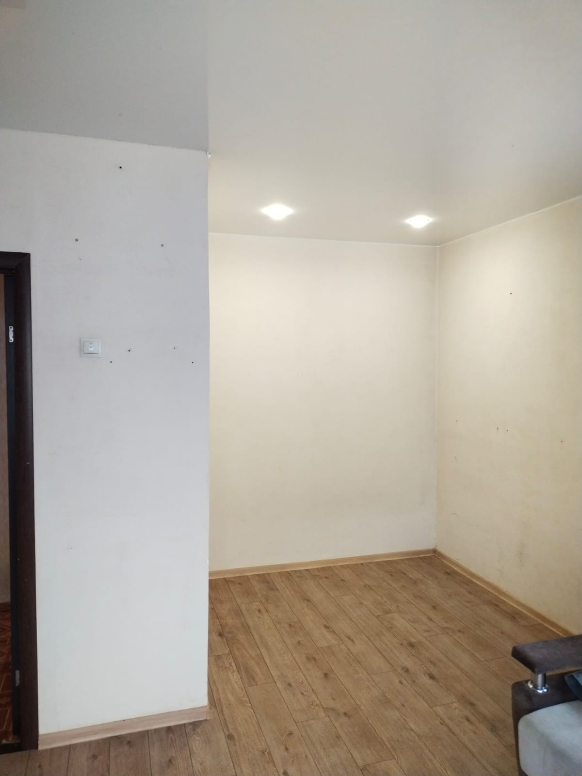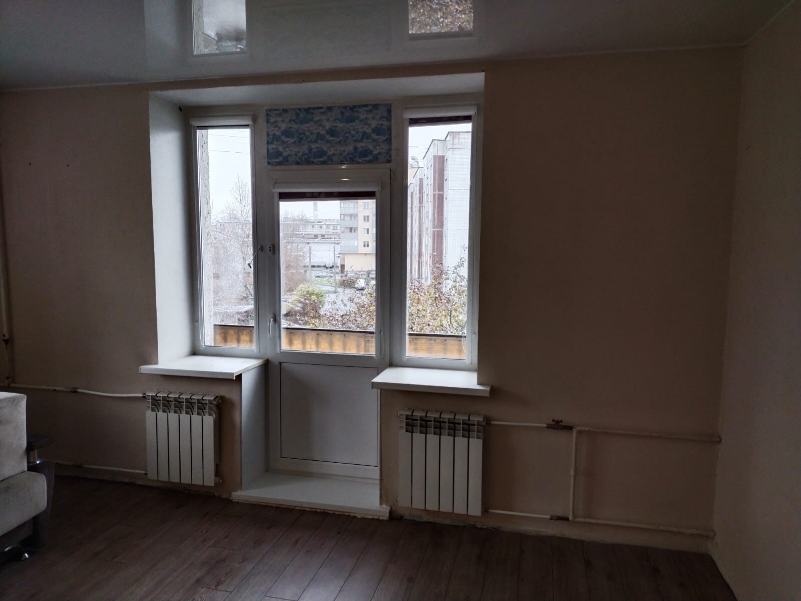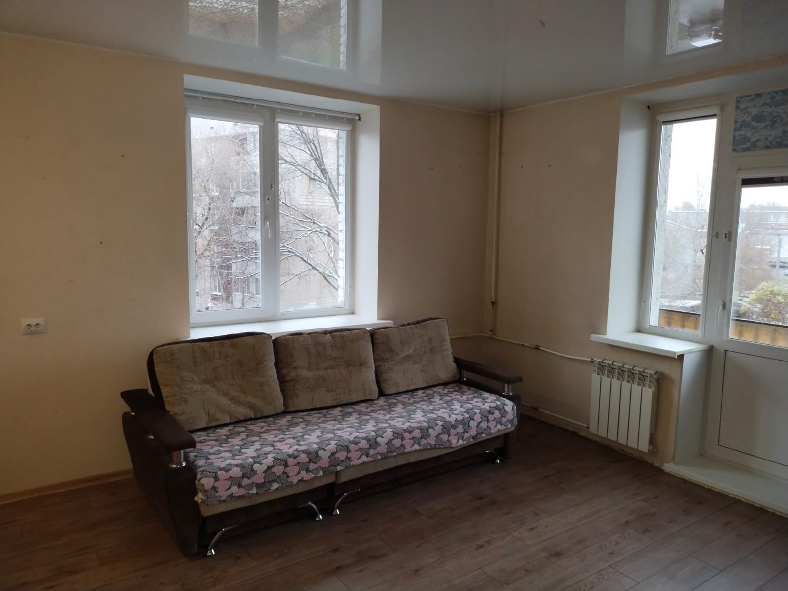 КОМНАТА: натяжной потолок, обои под покраску, на полу ламинат. Есть ниша для спальной зоны, на потолке выделенный свет. Окна на 2 стороны: окно на север и балкон на восток. На окнах рулонные шторы, батареи заменены.