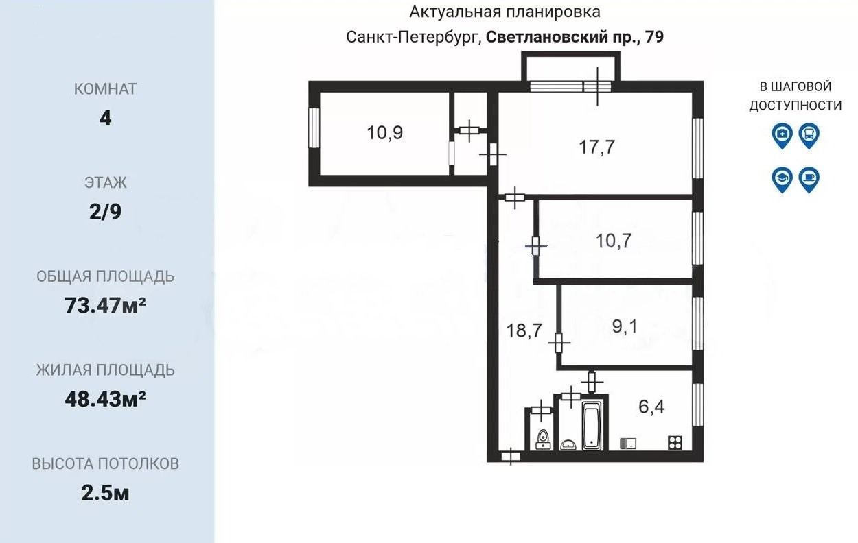 4-комнатная квартира, 73.6 м2, этаж 2 / 9, на продажу в Санкт-Петербурге, Светлановский проспект, 79