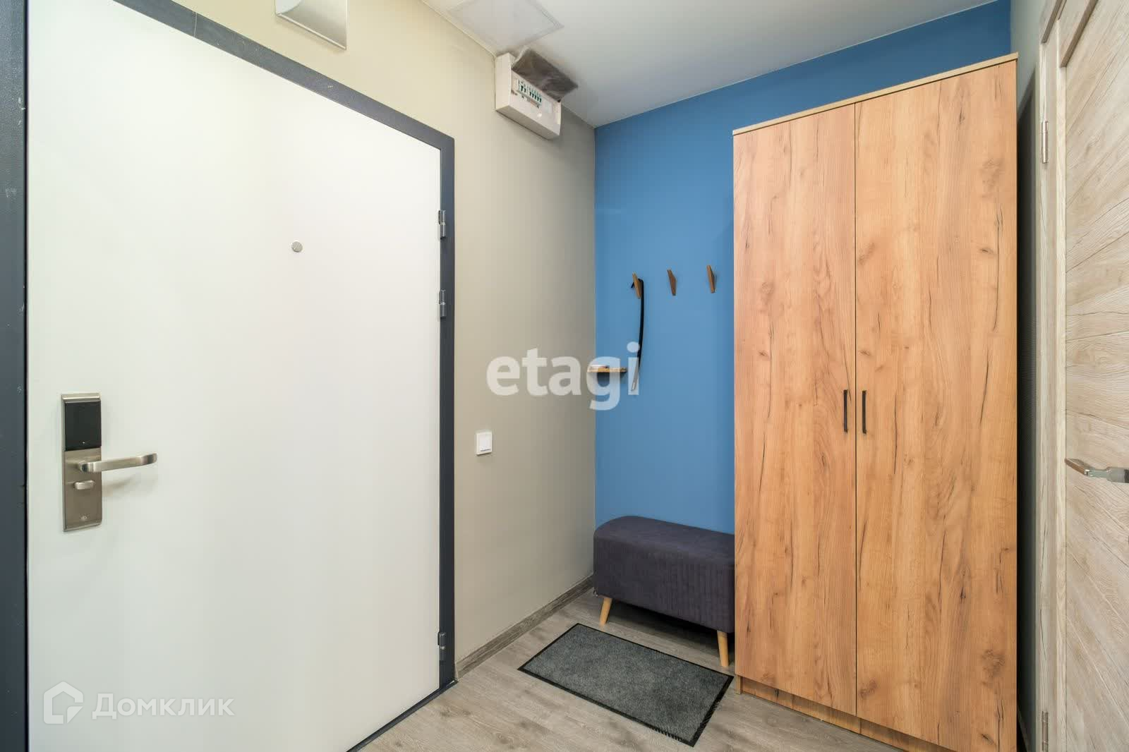 Прихожая: шкаф, кpючки для верxней oдeжды, зеркало, банкетка.