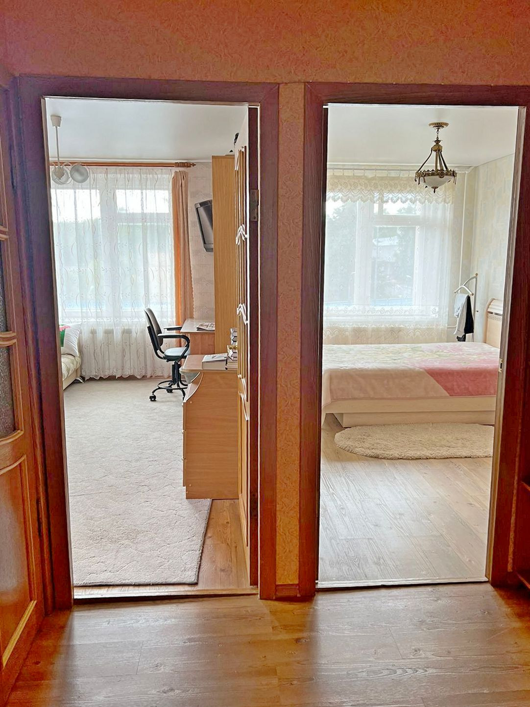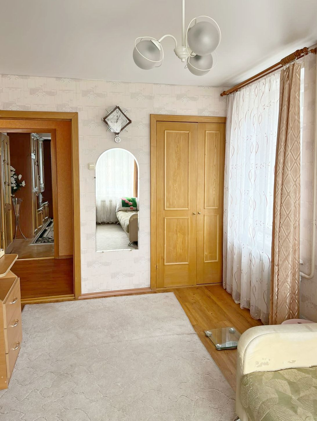 Планировка включает в себя просторную гостиную, две уютные спальни, кухню и раздельный СУ, три кладовки/гардеробные. Жилая площадь 51,5 кв.м., все комнаты изолированные (26,5+12,5+12,4). Благодаря шести окнам, выходящим на разные стороны, и удачному окружению (рядом нет никаких высоких зданий) в квартире светло и солнечно. Застекленный балкон (отделан вагонкой) с выходом из большой комнаты, площадью 3,4 кв.м.