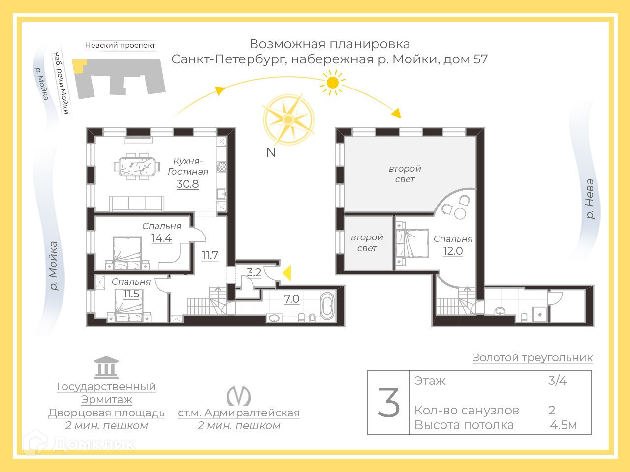 3-комнатная квартира, 110 м2, этаж 3 / 4, на продажу в Санкт-Петербурге, набережная реки Мойки, 57