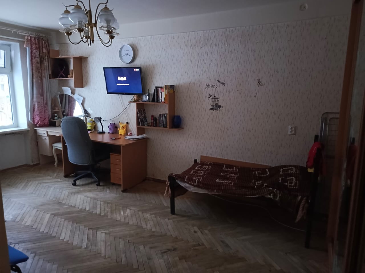 Квартира теплая. Комната правильной прямоугольной формы. Балкона нет. Сан узел раздельный. Окна - стекло пакеты, вид из окон в зеленый и тихий двор. Требует ремонта.