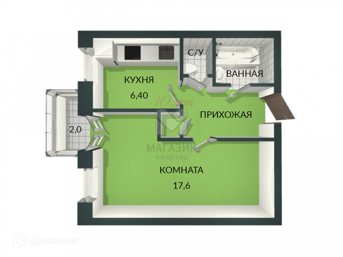 Общая площадь 33.2 м2