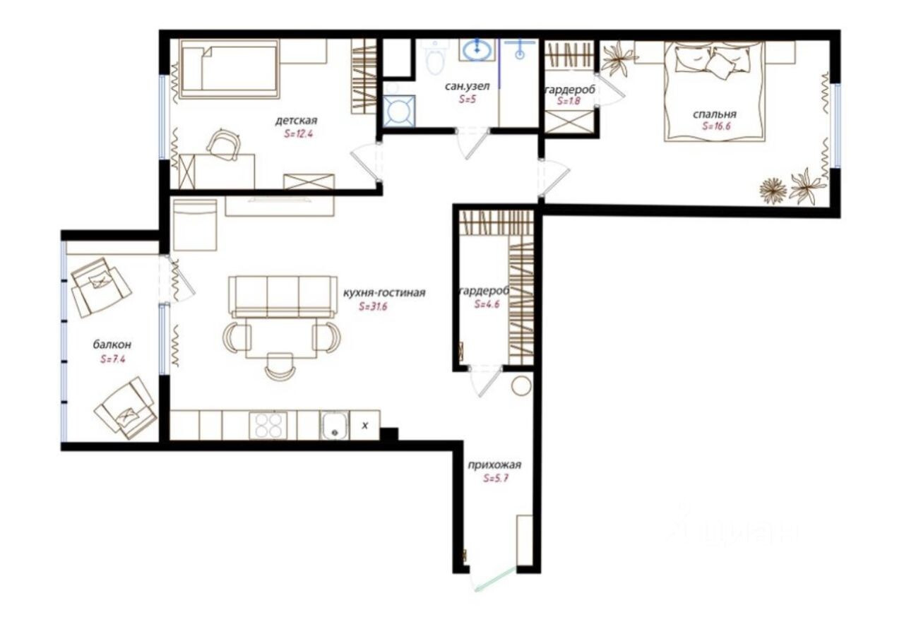 Трёхкомнатная евро квартира с двумя спальнями - 12,4 кв.м и 16,6 кв.м., просторная кухня-гостиная - 31,6 кв.м., две гардеробные комнаты. Просторная лоджия с панорамным остеклением - 7,4 кв.м.