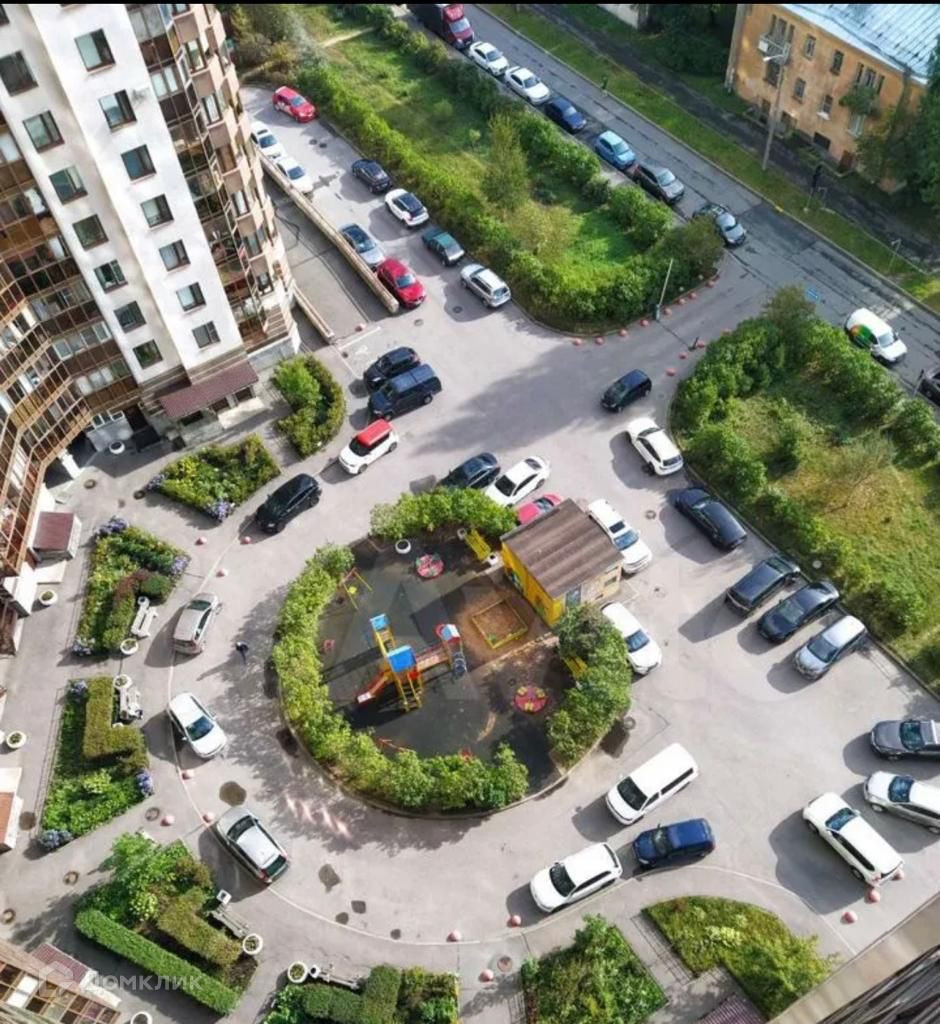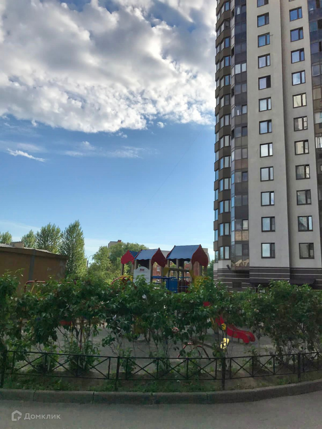 Очень зеленый двор с детскими и спортивными площадками, перед домом есть парковка.