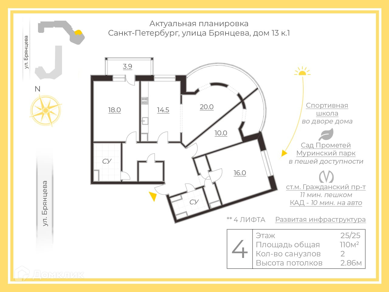 4-комнатная квартира, 110 м2, этаж 25 / 25, на продажу в Санкт-Петербурге, улица Брянцева, 13к1