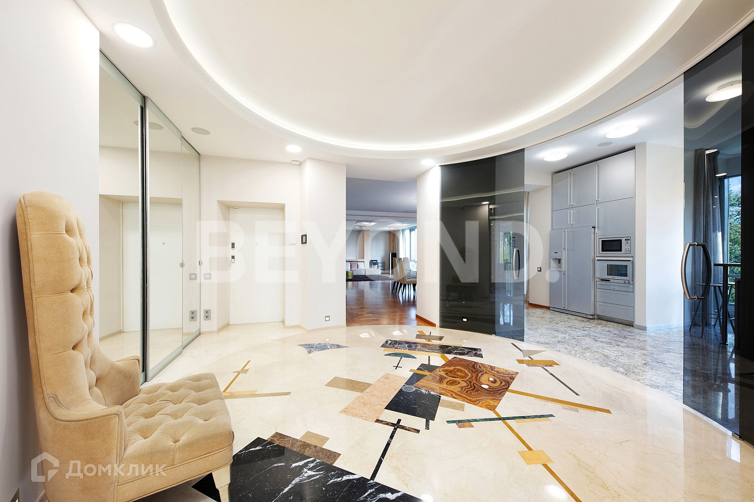 Холл раскрывает характер интерьера - функциональность, эстетика и комфорт. Вместительная гардеробная, гостевой санузел, напольное покрытие из натурального камня по мотивам абстрактного искусства известного художника.