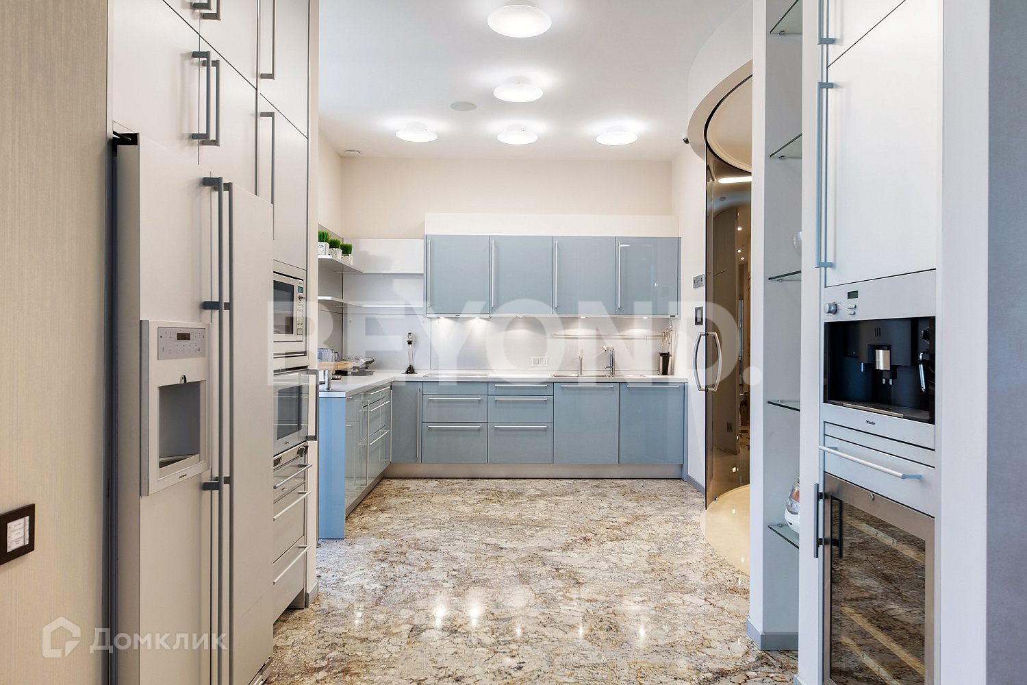 Приватная зона представлена мастер-спальней 35 кв. м с просторной ванной комнатой и гардеробной с окном, детской с ванной комнатой, хозяйственным блоком и кабинетом 41 кв. м с камином и морским аквариумом. Мебель Savio Firmino, Provaci, сантехника VilleroyBoch.