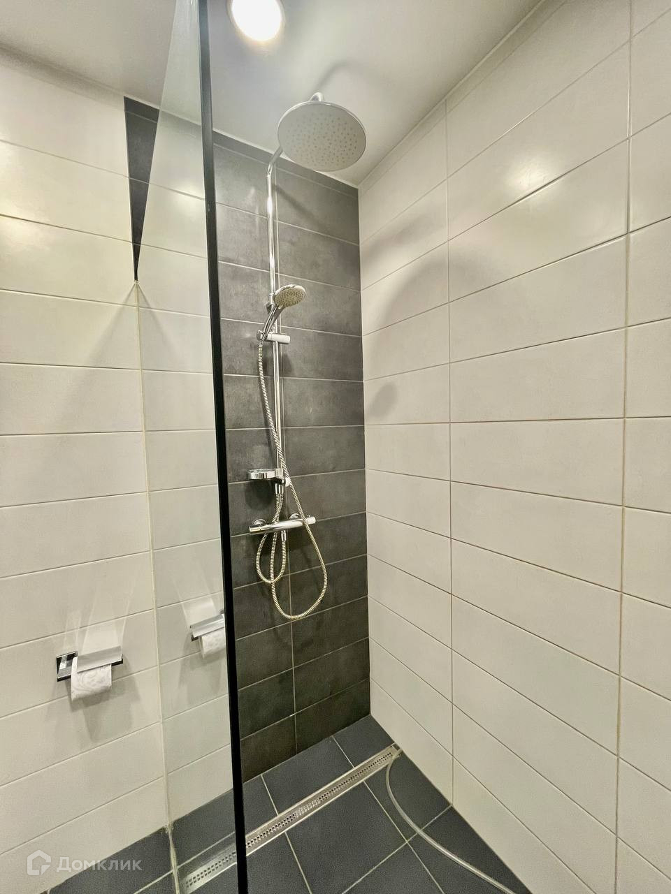 Керамогранит на полу и стене, только одна стена покрашена белой краской (затирка эпоксидная);