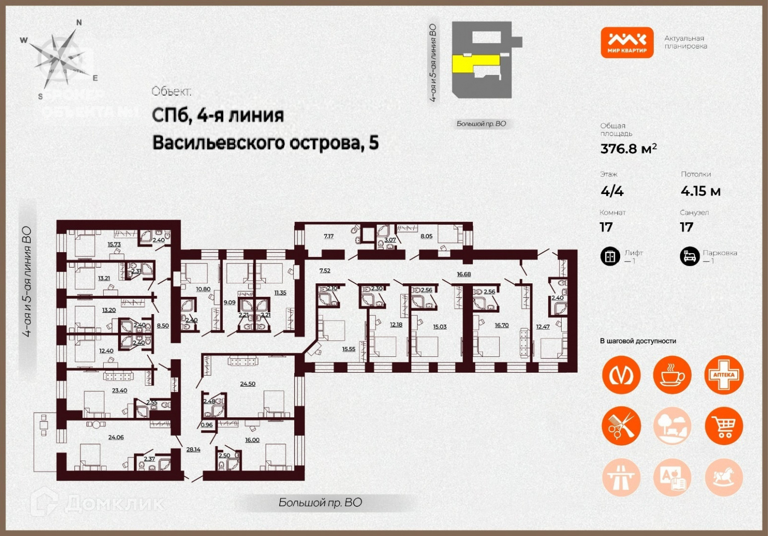 Многокомнатная квартира, 376.8 м2, этаж 4 / 4, на продажу в Санкт-Петербурге, 4-я линия Васильевского острова, 5