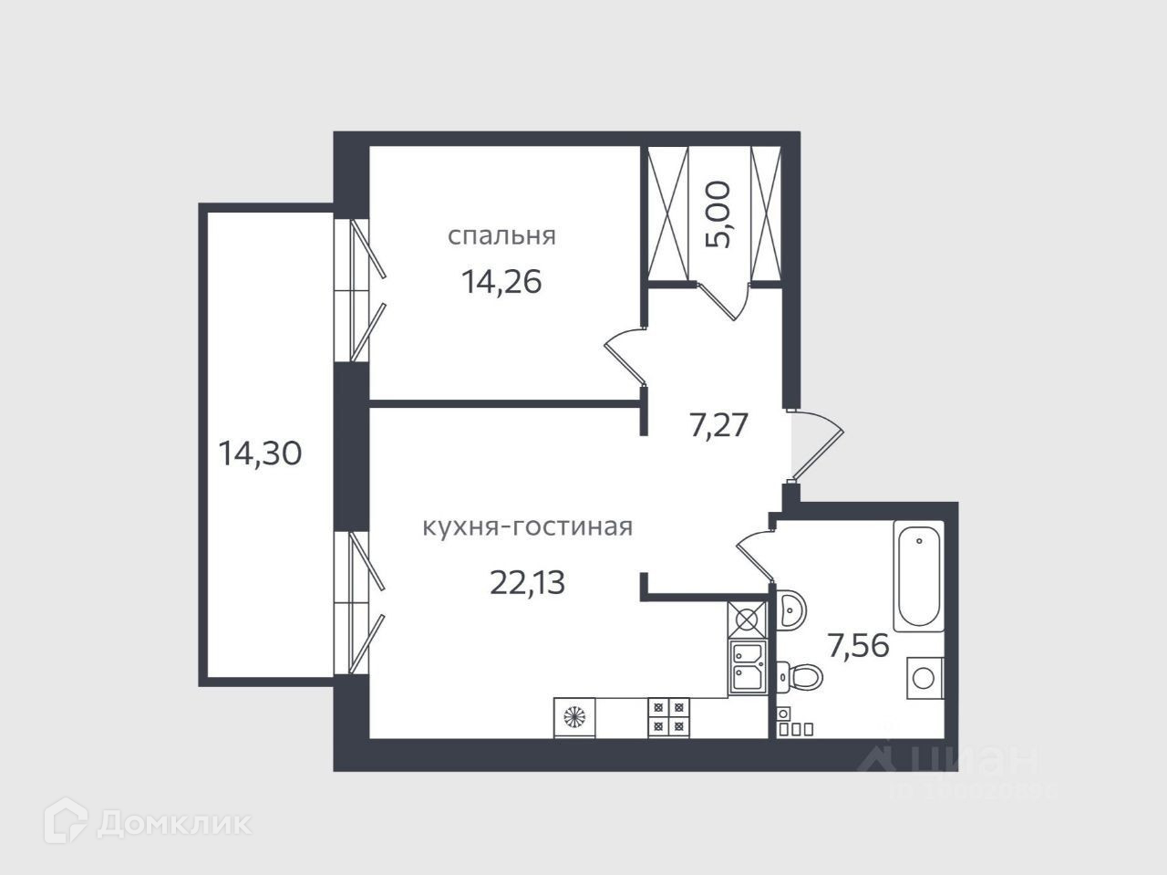 - Спальня 14м² и гардеробная 5м² - Кухня-гостиная 22м² - Санузел 7,5м² - Коридор 7,5м² - Терраса 14м²