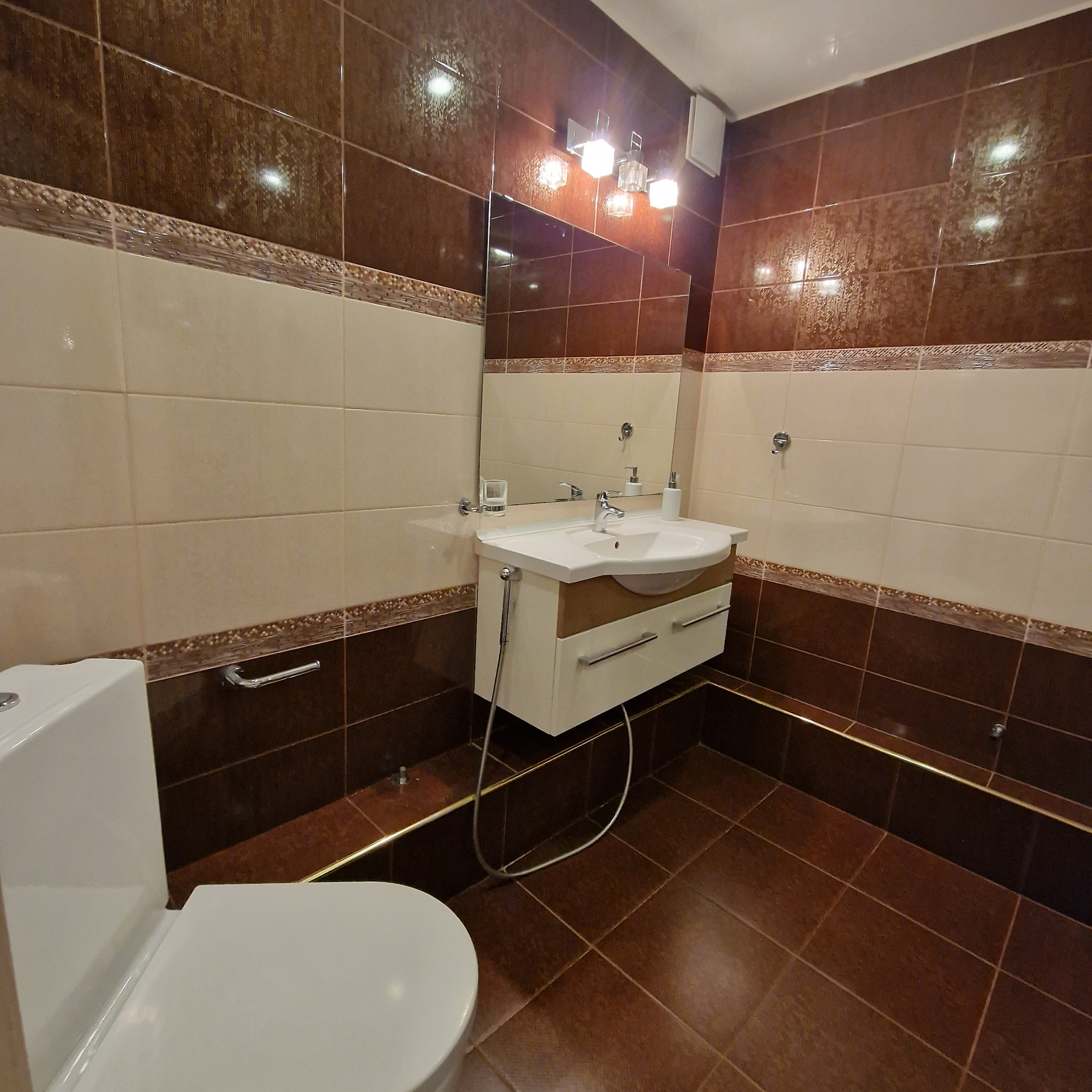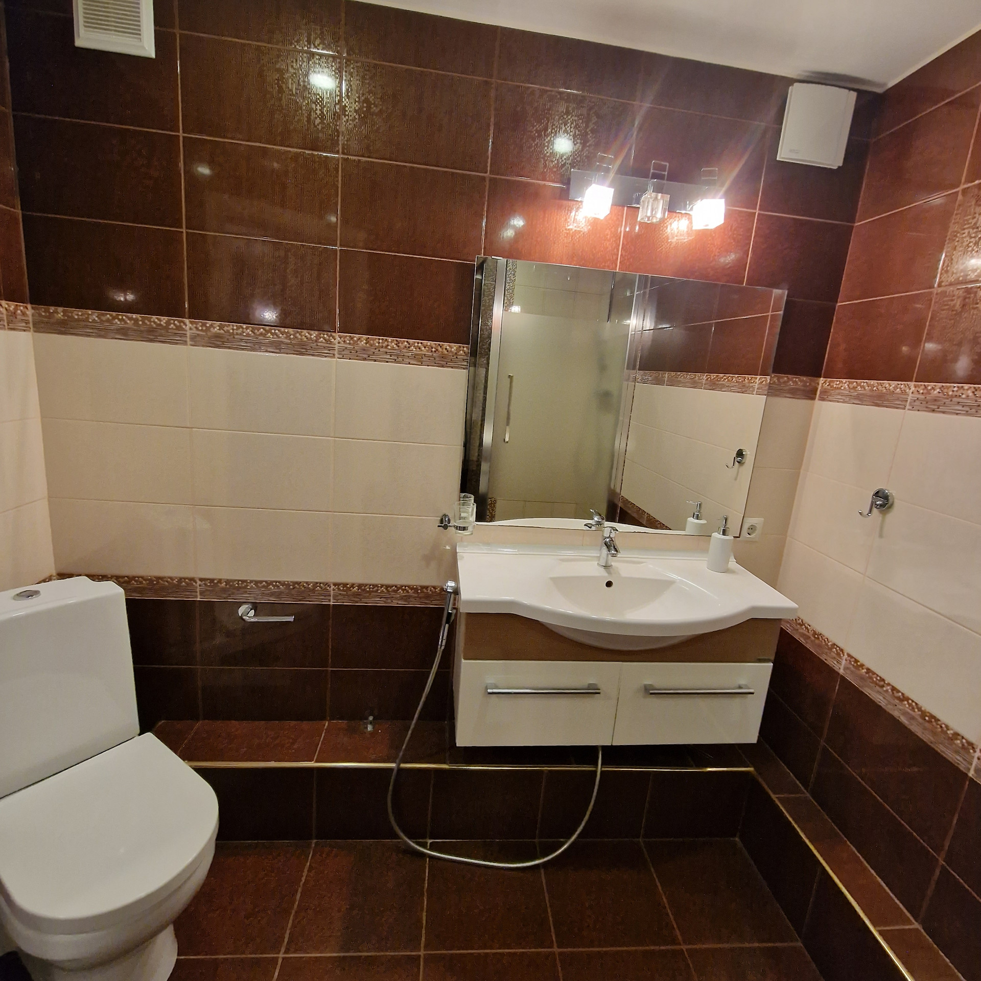 Просторный совмещенный санузел с душевой кабиной, площадью 5 кв.м. Современные мебель и техника. Ремонт дизайнерский, делался для себя, использовались дорогие качественные материалы. Идеально ровные стены, натяжные потолки, шумоизоляция.