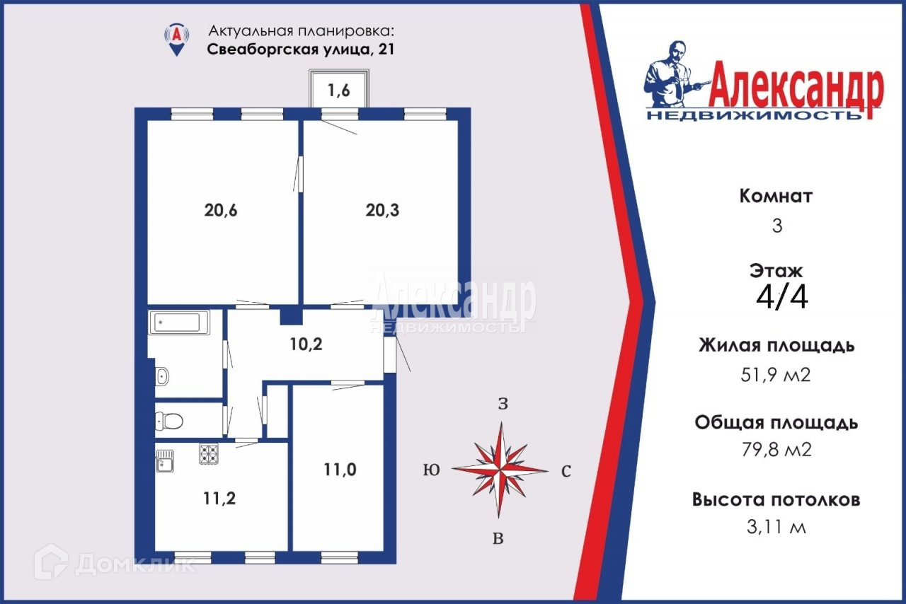 3-комнатная квартира, 79.8 м2, этаж 4 / 4, на продажу в Санкт-Петербурге, Свеаборгская улица, 21