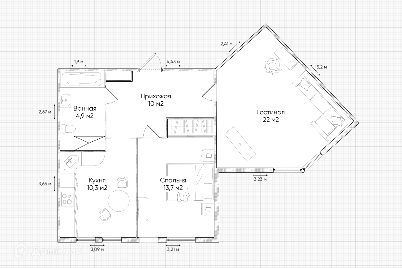 Общая площадь 60.8 м2