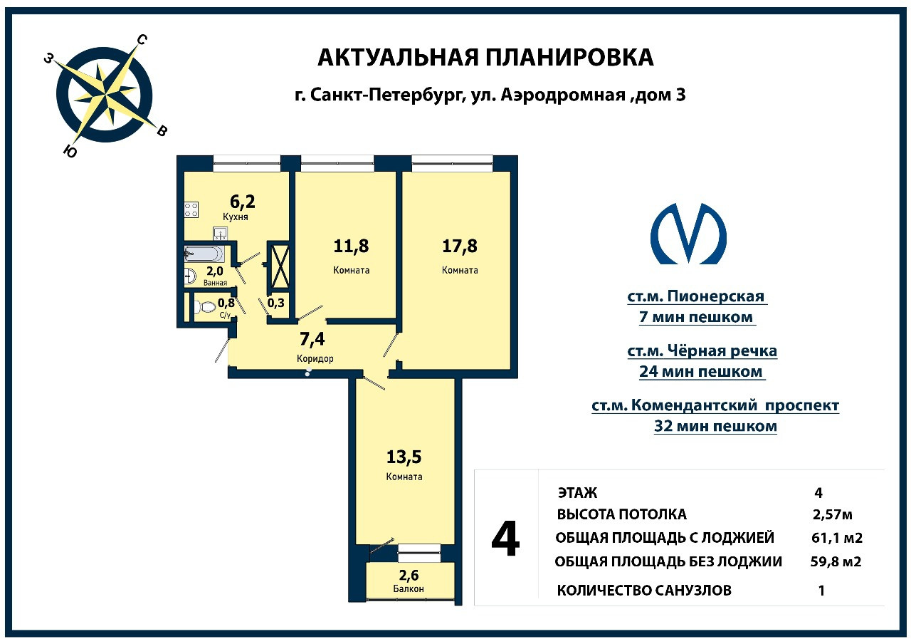 3-комнатная квартира, 62.4 м2, этаж 4 / 9, на продажу в Санкт-Петербурге, Аэродромная улица, 3