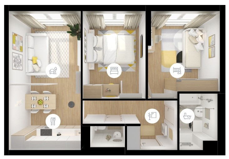 Светлая 3 евро - планировка с просторной кухней-гостиной в 20 метров позволит принимать гостей или разделить её по своему усмотрению.