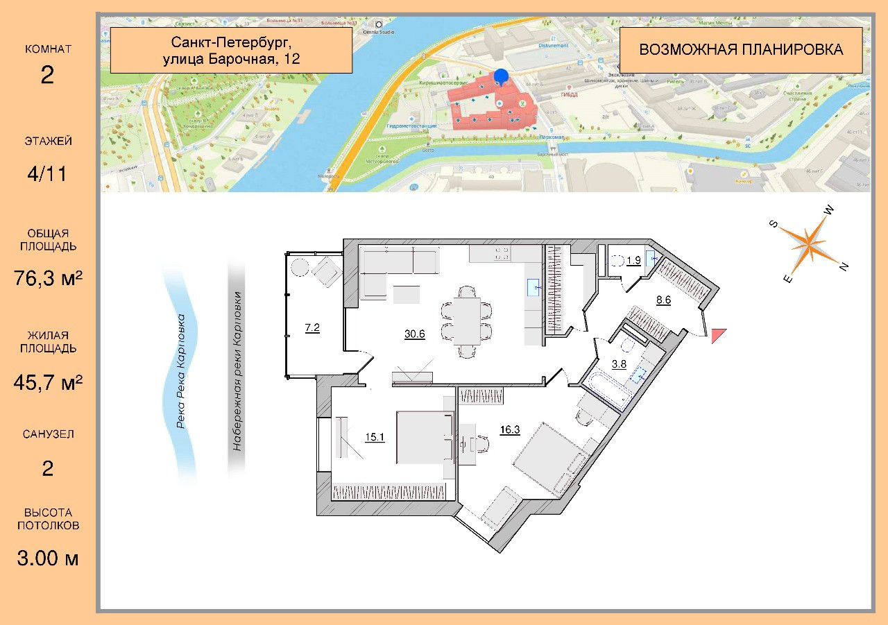 Общая площадь 76.3 м2