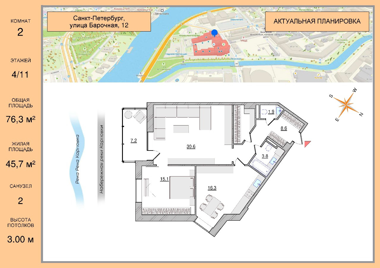 Квартира общей площадью 76,3 кв. м. расположена на 4 этаже из окон открывается великолепный вид на набережную реки Карповка.