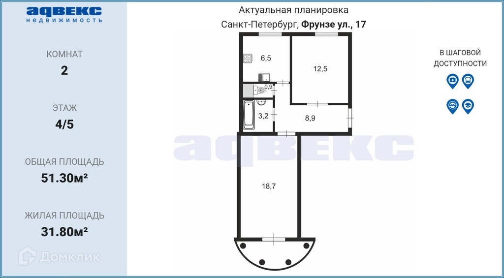 Общая площадь 51.3 м2