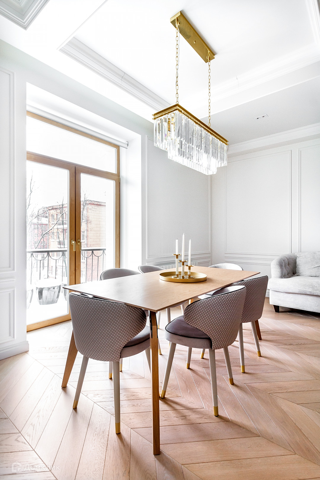 Просторная гостиная с большими окнами в пол и балконом.