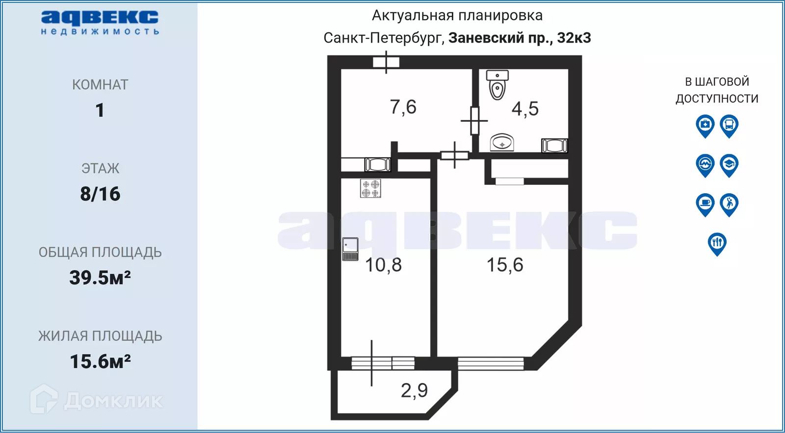 1-комнатная квартира, 39.5 м2, этаж 8 / 16, на продажу в Санкт-Петербурге, Заневский проспект, 32к3