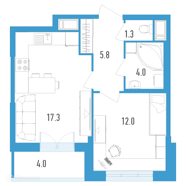 Общая площадь 42.4 м2
