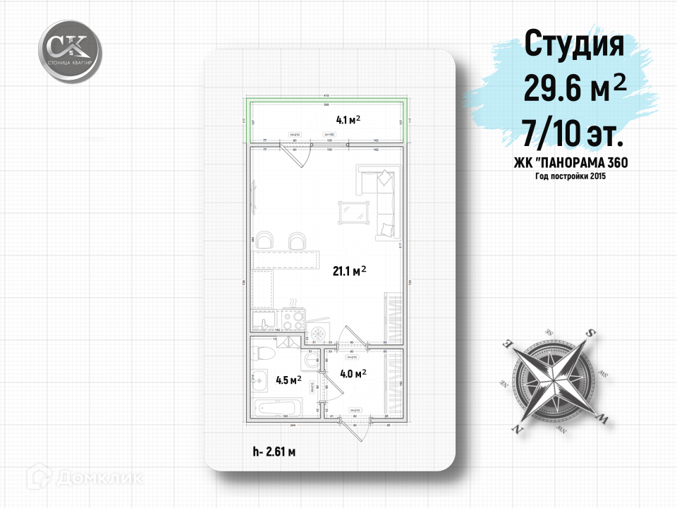 • Общая площадь 29.6 м²  (без учета балкона 4.1 м²)