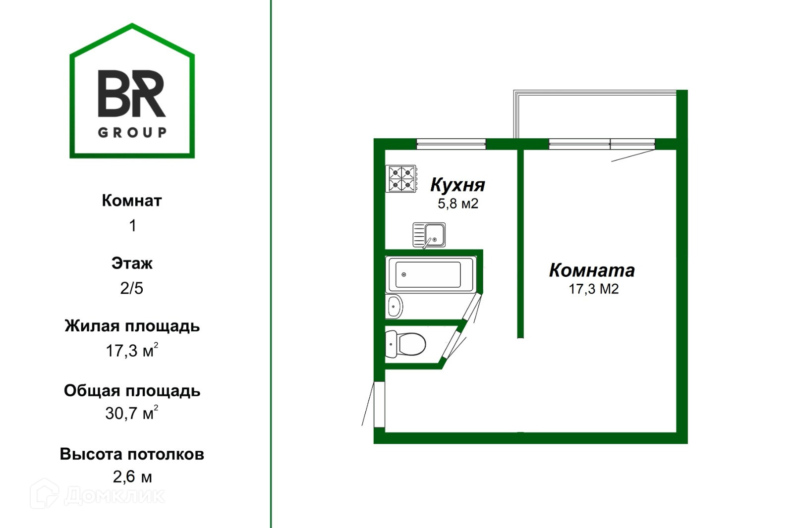Общая площадь 30.7 м2