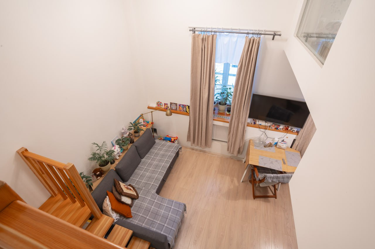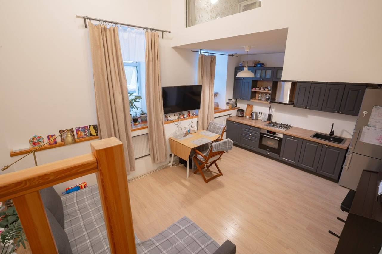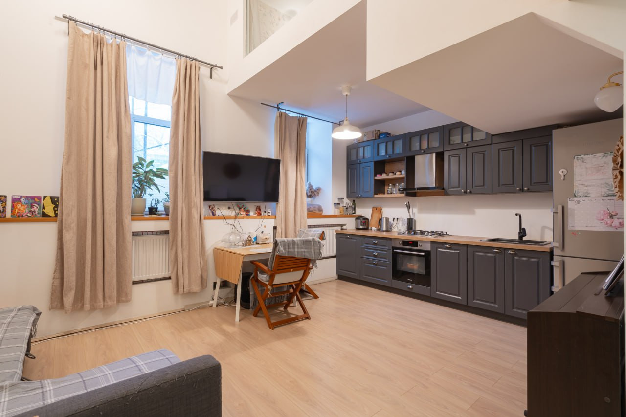 Высокие потолки в 4,3 м позволили применить современное дизайнерское решение - второй свет. За счет чего и без того просторная кухня-гостиная стала еще объемнее, воздушнее.