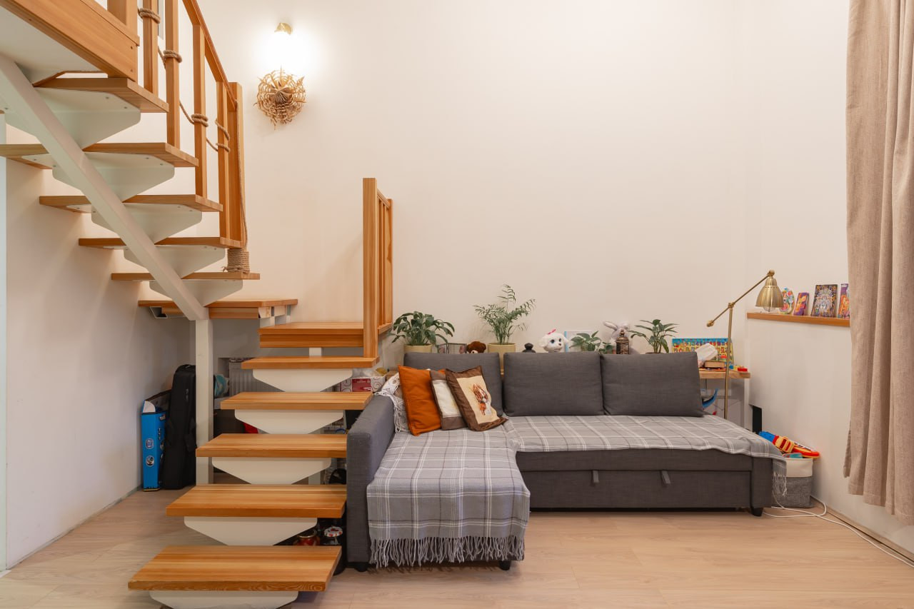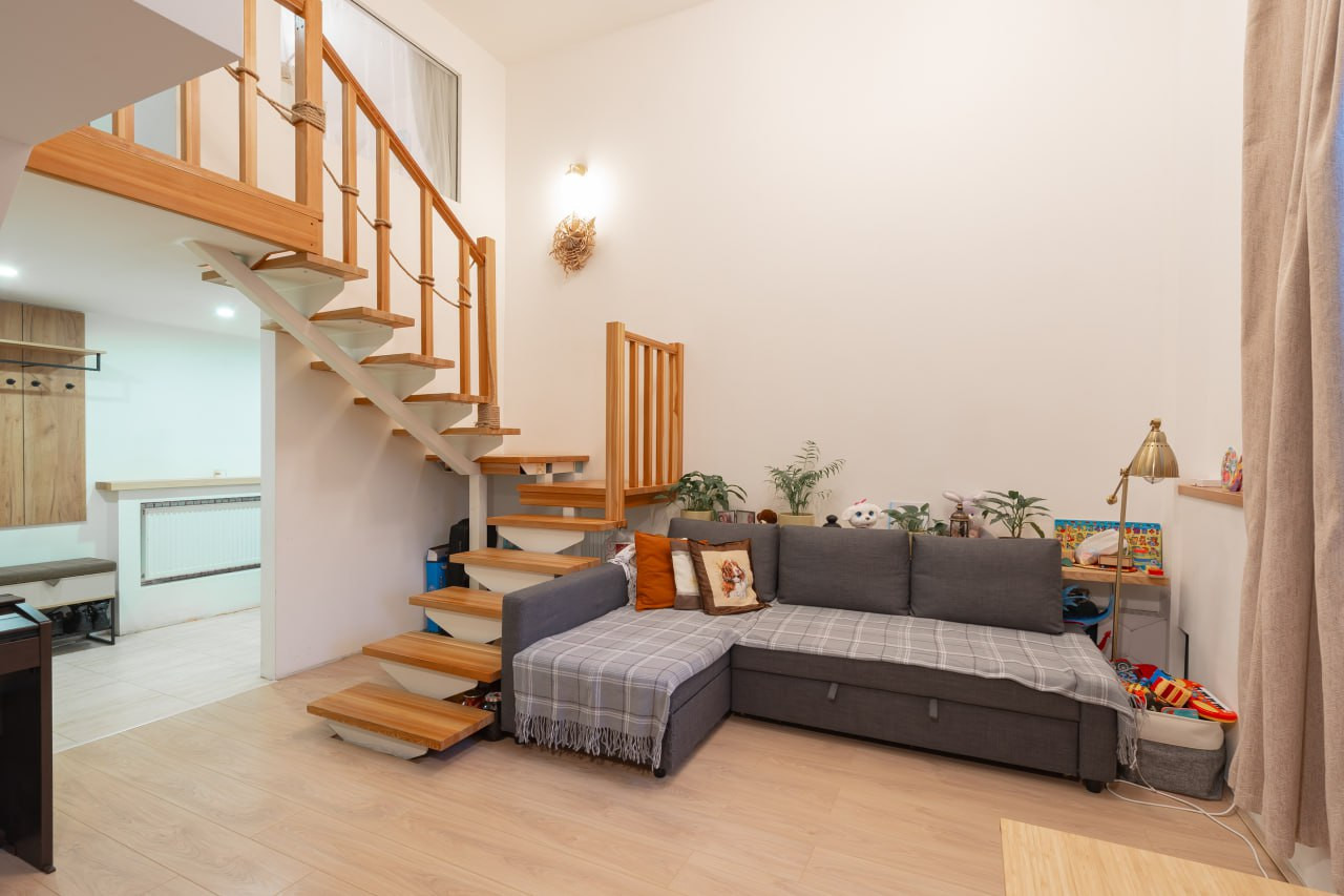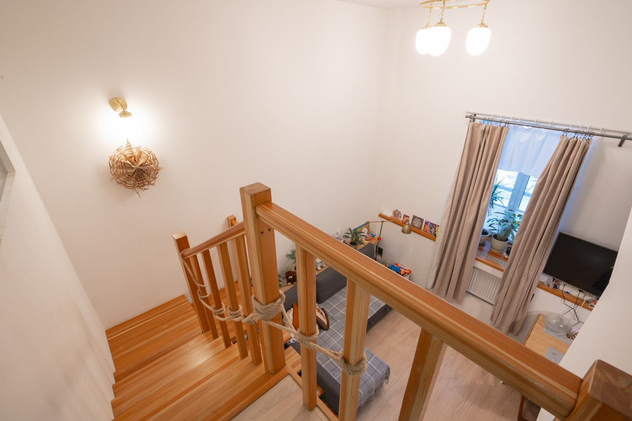 Изящность и красивый вид квартире придает деревянная лестница. Сама лестница удобная с продуманным уклоном, шириной и высотой ступеней.