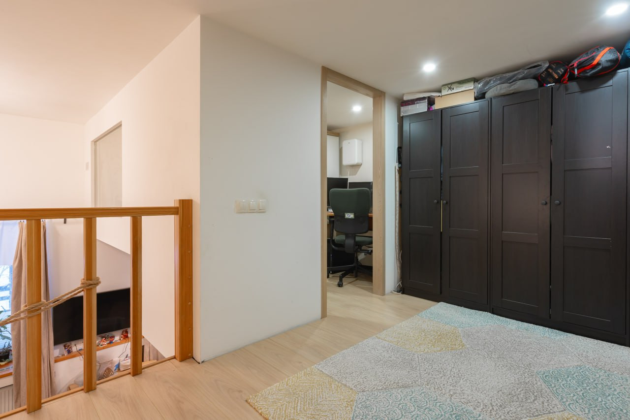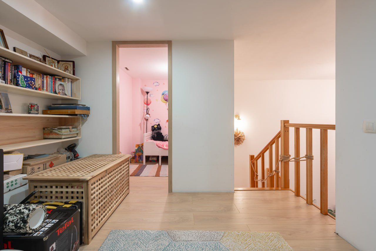 Два уровня квартиры, комнаты в которых находятся на разных этажах не только подчеркивают хороший вкус, но и престижность жилья. Огромный плюс наличия двух этажей в квартире состоит в изолированности общего пространства. Пространство первого этажа – общие (кухня-гостиная 23 м2, прихожая 5,8м2, совмещенный санузел 6 м2), второго – приватное (две комнаты 11 и 3,5 м2 и свободная зона для хранения вещей 7 м2). По желанию пространство на втором этаже можно превратить в просторную спальню с современной гардеробной. Высота потолка на втором ярусе 2 метра.
