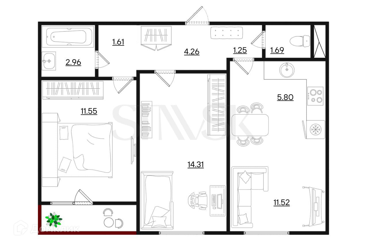 Общая площадь 54.95 м2
